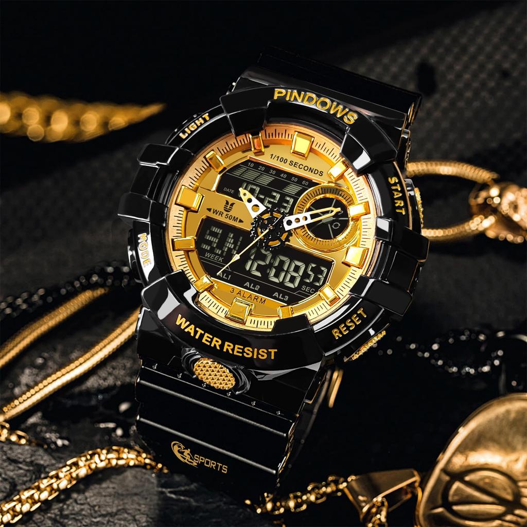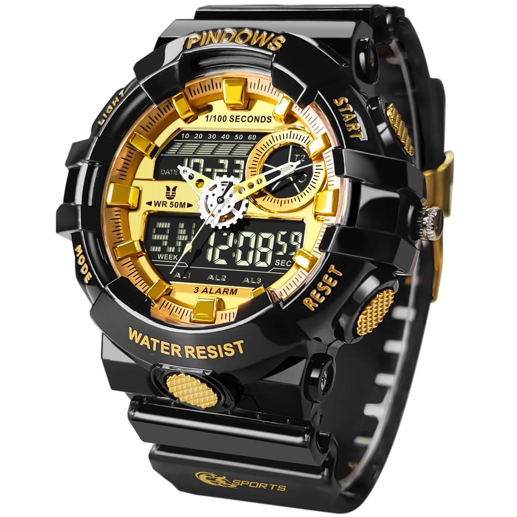 PINDOWS Прозрачные Золотые Двойные 50м Водонепроницаемые Светодиодные Будильники и Идеальные для Ношения на Открытом Воздухе и Повседневного Ношения Мужские Часы, Аналогово-Цифровое Время, Устойчивые, Подсветка,