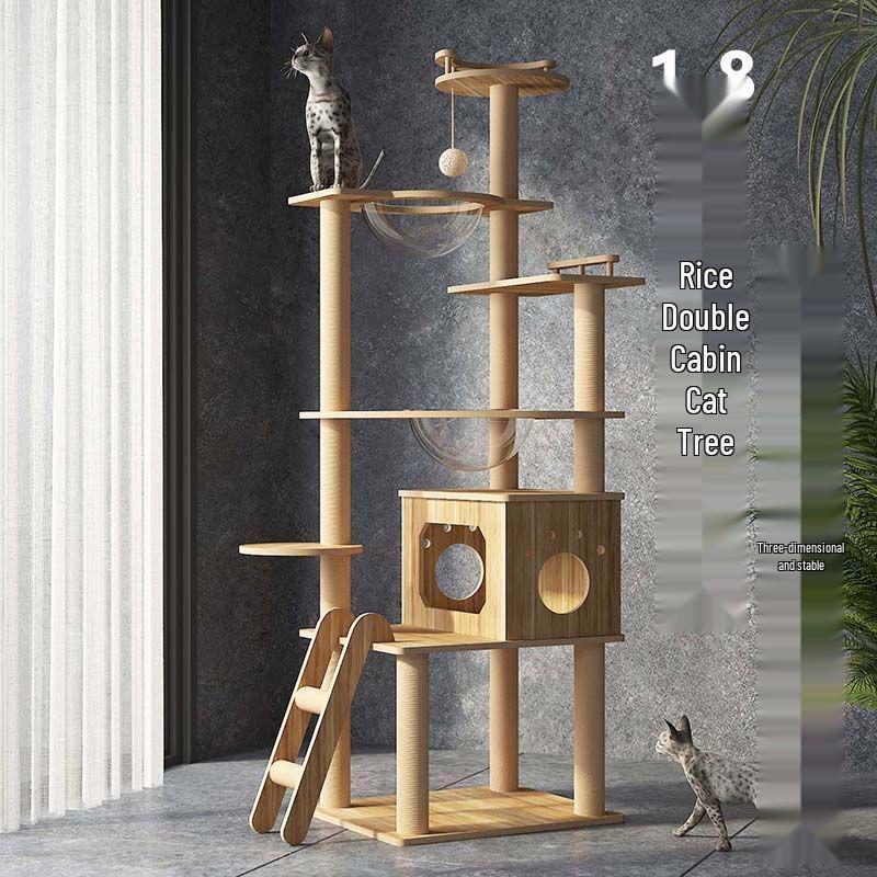 Большая кошачья игровая башня со встроенной кроватью-капсулой, когтеточкой, платформой от пола до потолка и полками.