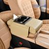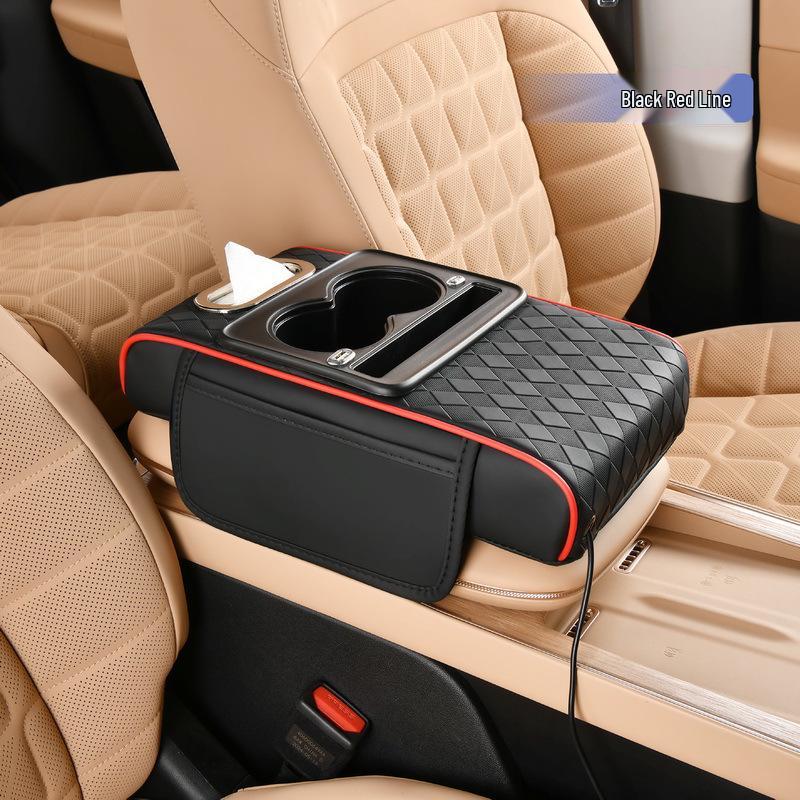 Ромбовидный зарядный подлокотник для автомобиля с кожей наппа, двойным подстаканником, хранилищем и коробкой для салфеток.