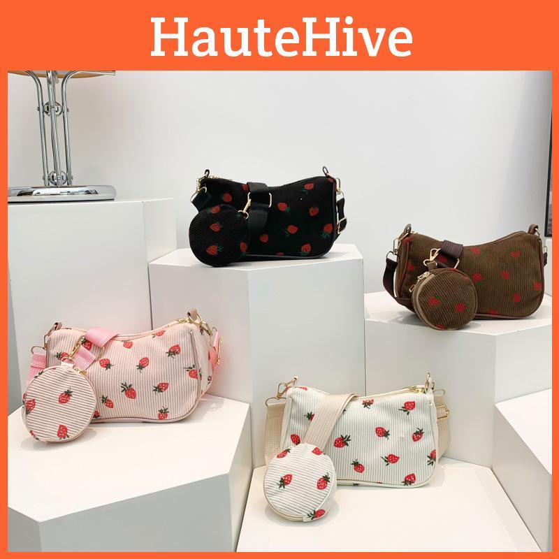 Strawberry Print Corduroy Shoulder Bag Fashion Girl Pillow Bag For Casuals Daily