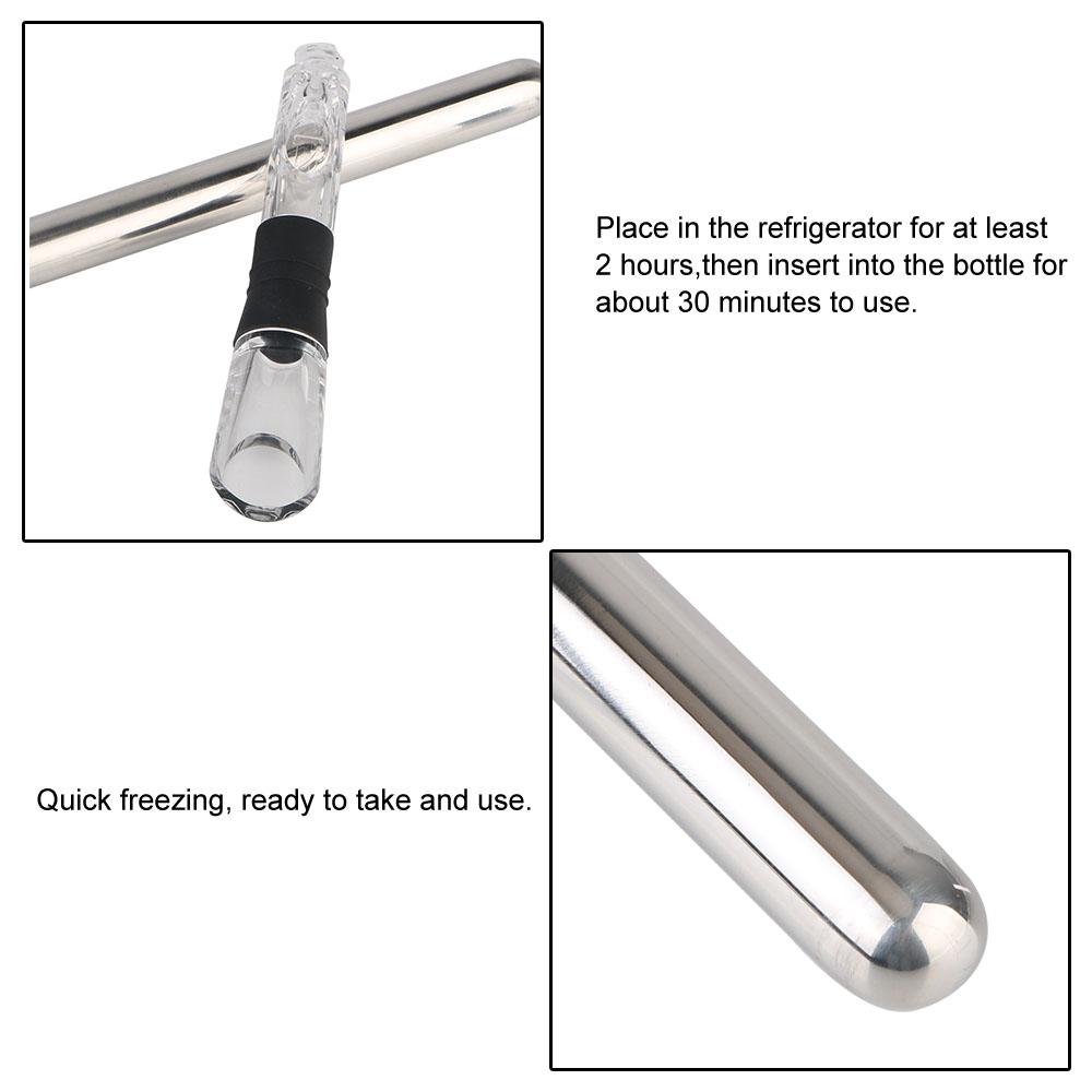 Поместите сухой охлаждающий стержень в холодильник как минимум на 2 часа, затем откройте вино, дайте ему проветриться в течение 15 минут, вылейте немного вина, затем вставьте охлаждающий стержень в бутылку примерно на 30 минут для использования.