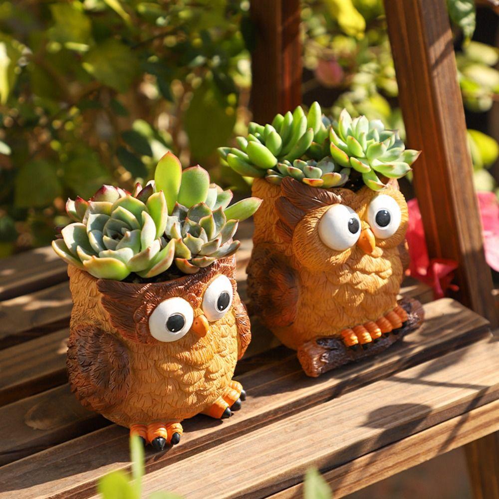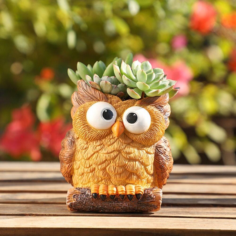 Cartoon Owl Planter Resin Animal Vase Pen Container Green Plants Potted