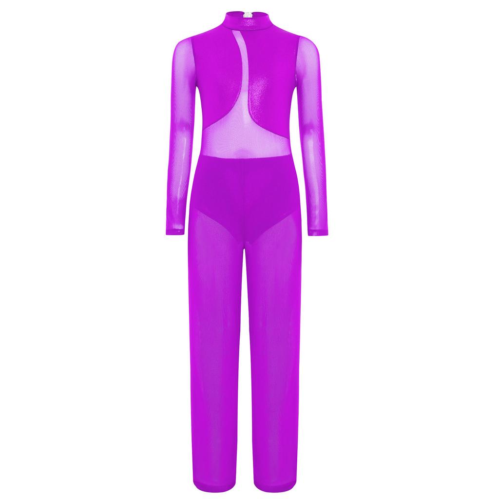 Костюм для гимнастических выступлений для девочек, комбинезон с широкими штанинами, из прозрачной сетки в стиле пэчворк, с длинными металлизированными рукавами
