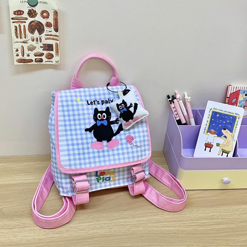 Клетчатый милый рюкзак с принтом кошки и иллюстрацией животного, школьная сумка для девочек