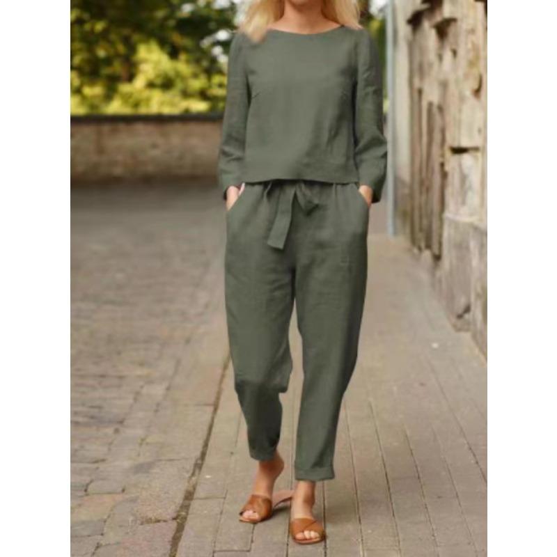 Весенне-осенний хлопково-льняной винтажный топ с длинным рукавом, женский эластичный брючный комплект на шнуровке, женский однотонный повседневный костюм