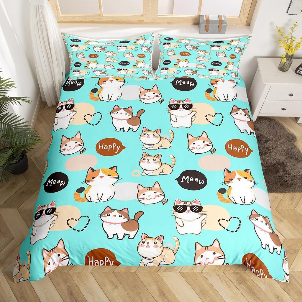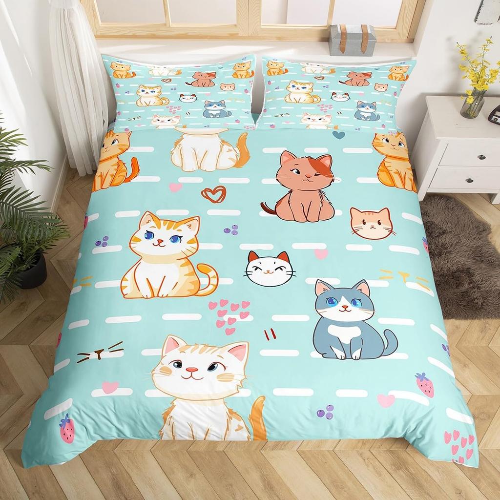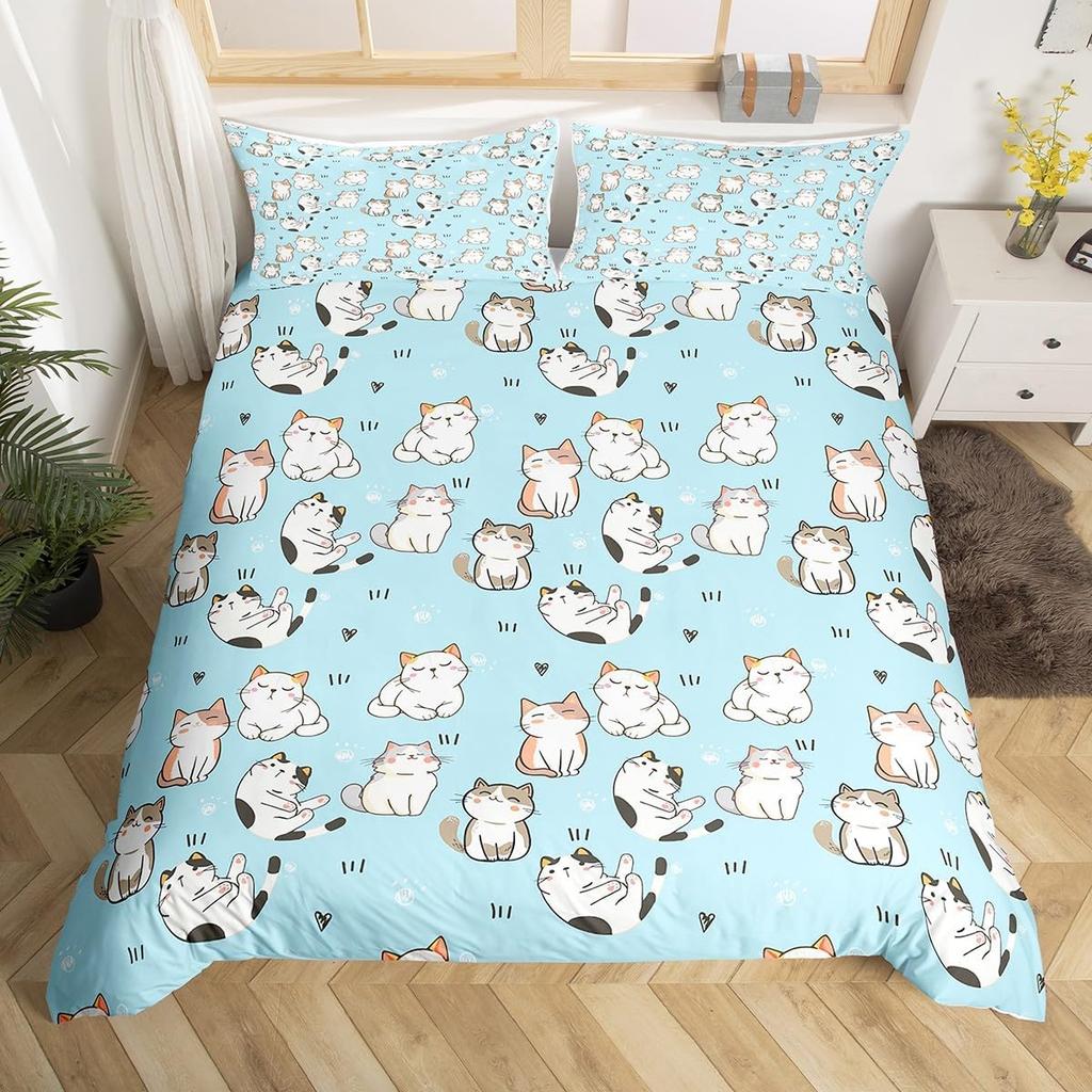 Kawaii Cat Duvet Cover Single Queen for Boys Girls Cute Kitten Pet Bedding SetMicrofiber Blue Comforter Cover with 2 Pillowcase