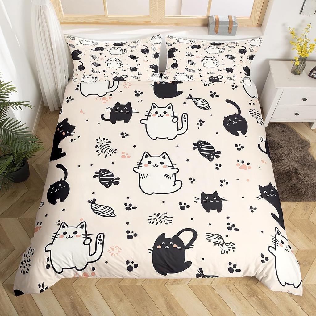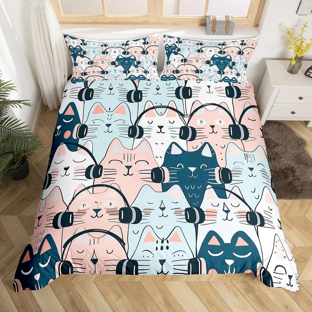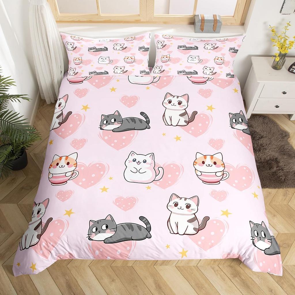 Kawaii Cat Duvet Cover Single Queen for Boys Girls Cute Kitten Pet Bedding SetMicrofiber Blue Comforter Cover with 2 Pillowcase