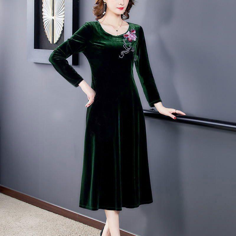 Женское платье большого размера Осень Зима Вышитое Круглый вырез Миди Длина Золотой бархат Платье Приталенное А-силуэт