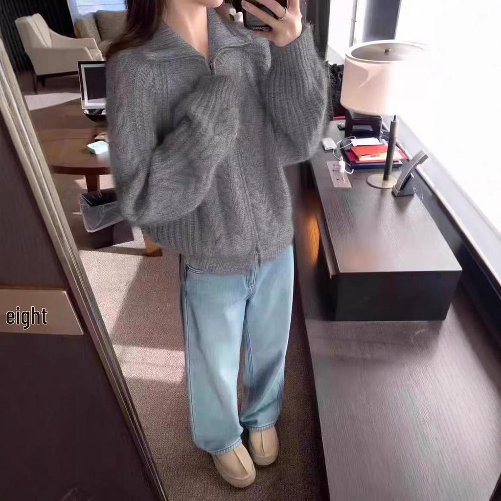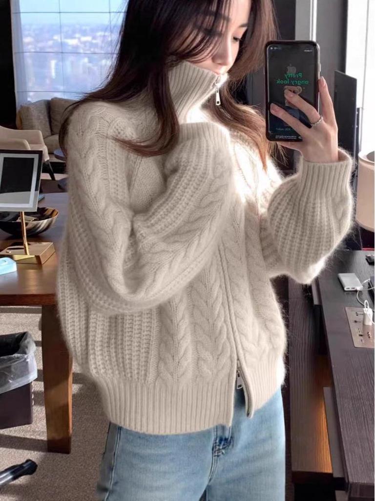 Женский кардиган из толстой шерсти крупной вязки «косы» - с высоким воротом, рукавом реглан, толстой вязки в пять игл, свободный свитер на молнии