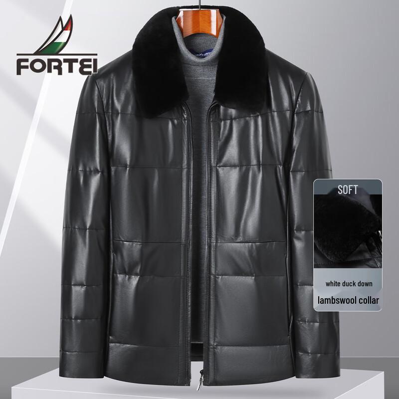 Futing Men's Sheepskin Down Leather Jacket with Lamb Wool Collar