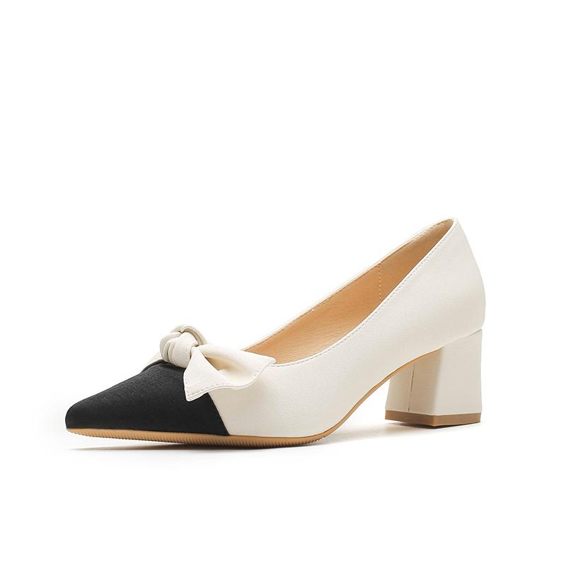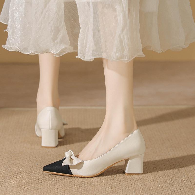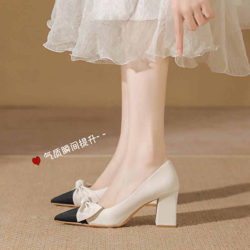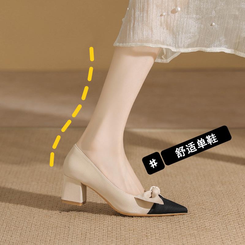 Туфли нежные острый носок мелкий вырез толстый каблук одинарные туфли женские бант темперамент универсальные туфли на высоком каблуке женские