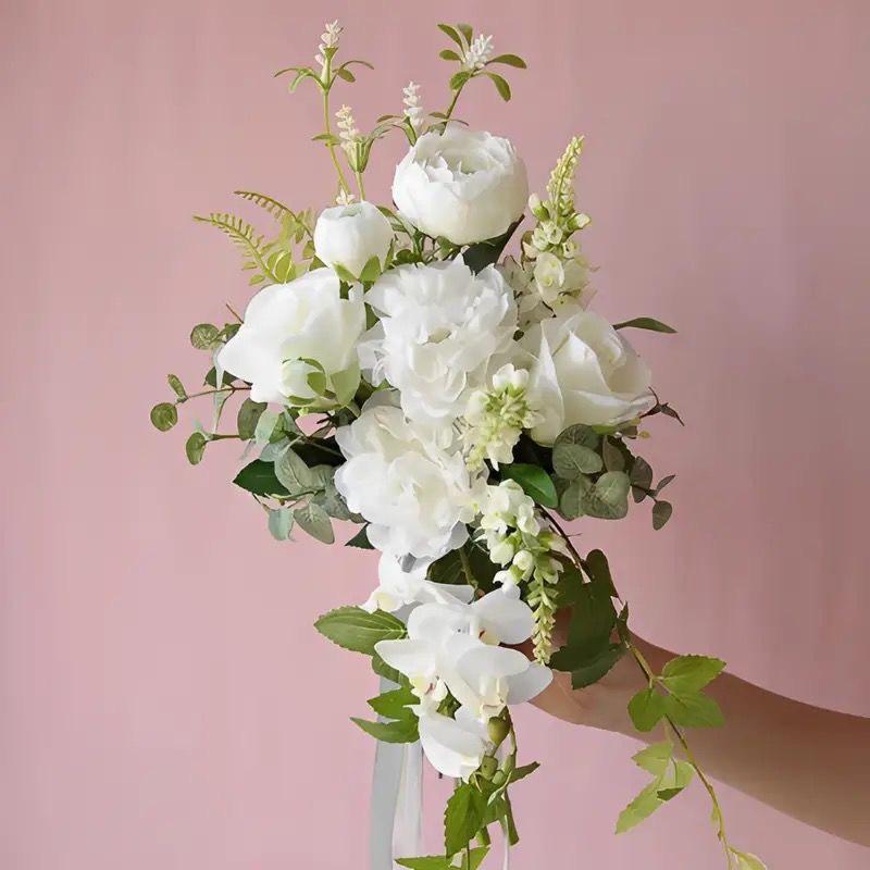 Элегантный белый каскадный букет: Искусственные цветы фаленопсис и каллы для свадебной фотографии