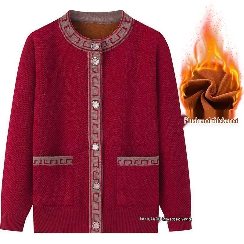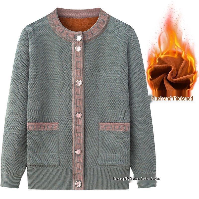 Женский вязаный кардиган с плюшевой подкладкой - Теплое осеннее пальто для женщин среднего и пожилого возраста