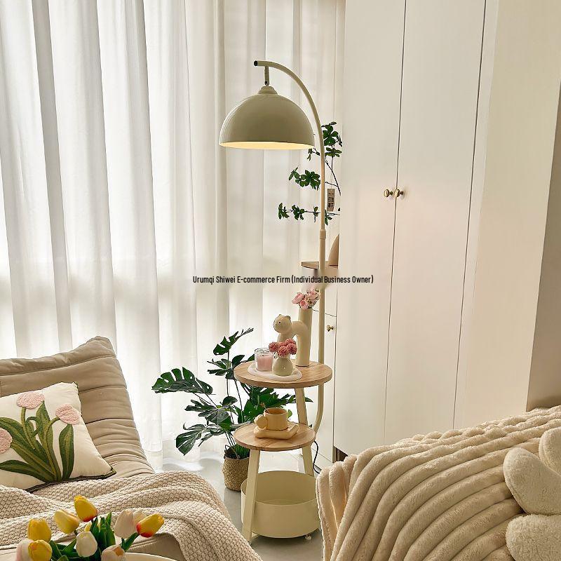 Кремовый угловой диван в стиле середины века, торшер и прикроватный столик со встроенной беспроводной зарядкой.