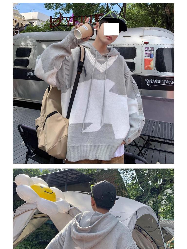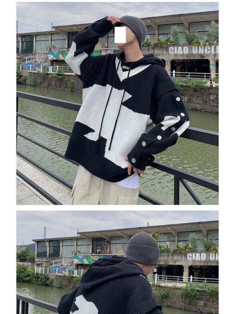 Мужской черно-белый вязаный свитшот в стиле пэчворк, Осень/Зима, Куртка оверсайз с капюшоном, Повседневный стиль высокого класса.