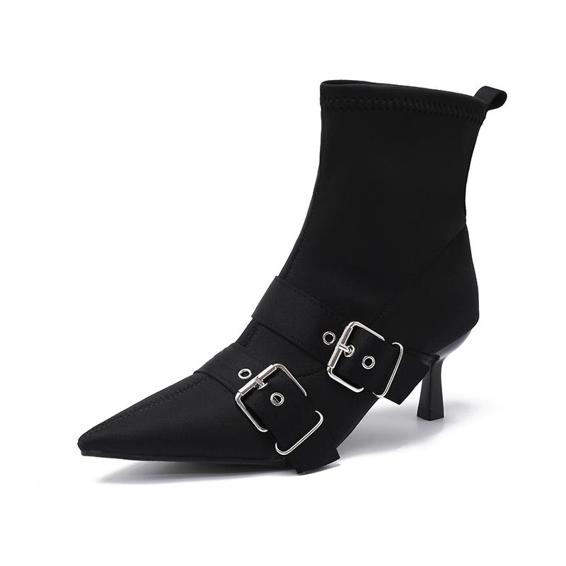 Винтажные ботильоны-стилетто Осень Новые Острый носок Металлическая пряжка Задняя молния Противоскользящие Износостойкие каблуки
