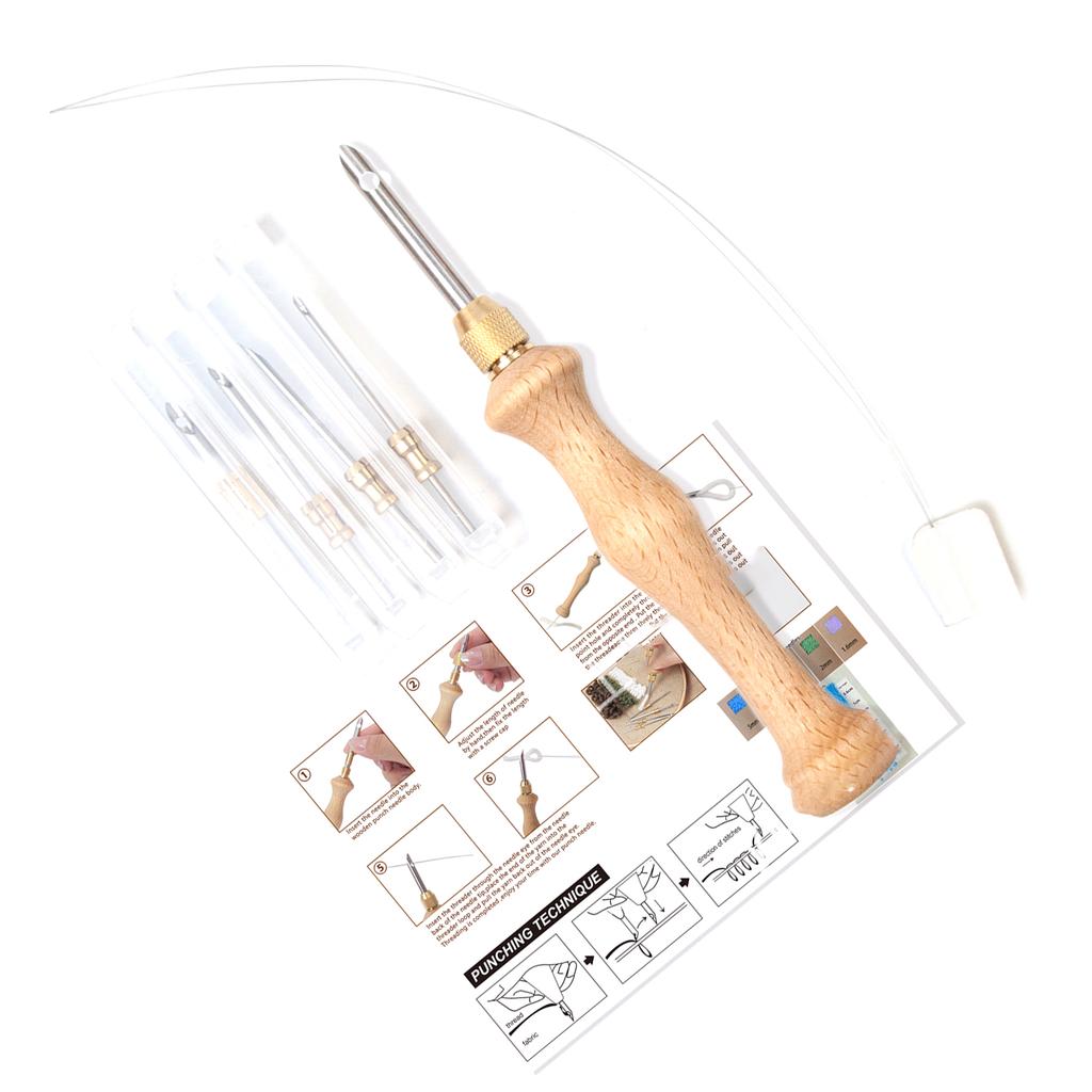 В комплект входят иглы для пробивки отверстий с деревянной ручкой и 5 наконечниками для игл для пробивки отверстий разного размера, чтобы вы могли завершить свое рукоделие.. Головка булавки имеет размеры около 5 мм, 3,5 мм, 2,5 мм, 2 мм, 1,6 мм.