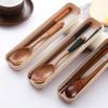 Набор, отличающийся портативным дизайном с гладкими, полированными поверхностями, включает палочки для еды и ложку, которые демонстрируют естественную текстуру дерева для эстетической привлекательности и удобного использования.