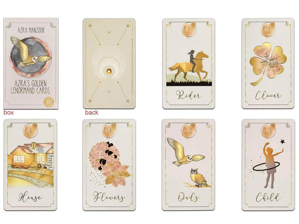 Эта исключительная колода сочетает мистицизм традиционных карт Ленорман с ослепительным блеском роскошного золота.