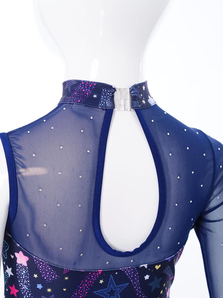 Детский гимнастический купальник с принтом, дизайн «Звездный леопард змеиная кожа», блестящие стразы, вставки из прозрачной сетки, асимметричный боди