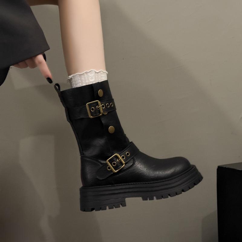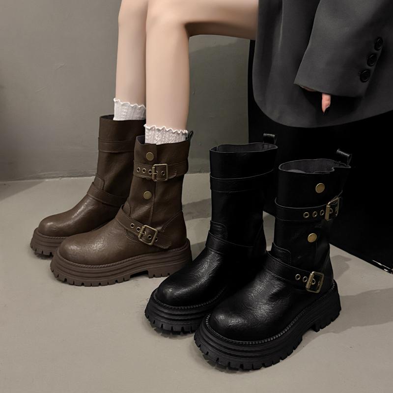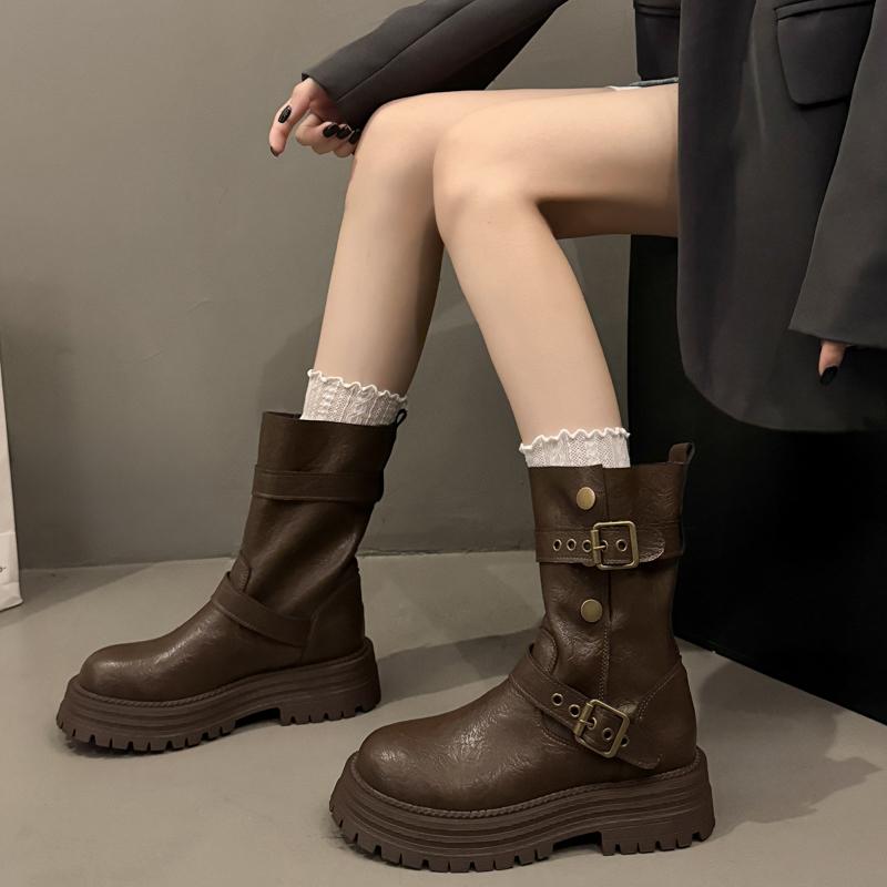 Новый стиль Модные женские кожаные полусапоги Коричневые с круглым носком Женские ботинки до середины икры Дизайнерские Роскошные Удобные и Элегантные