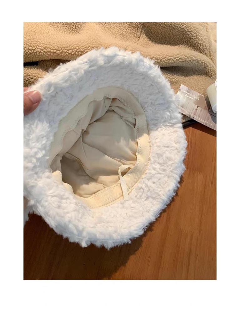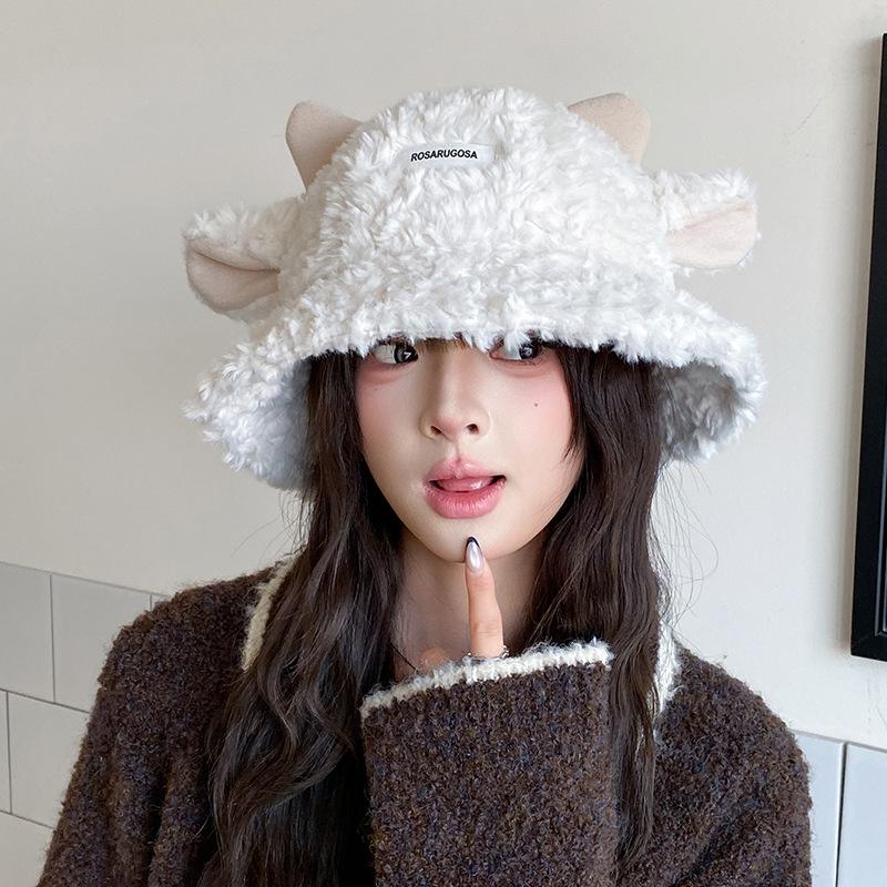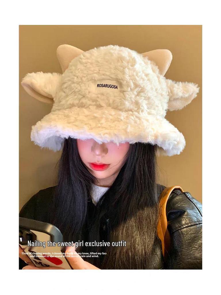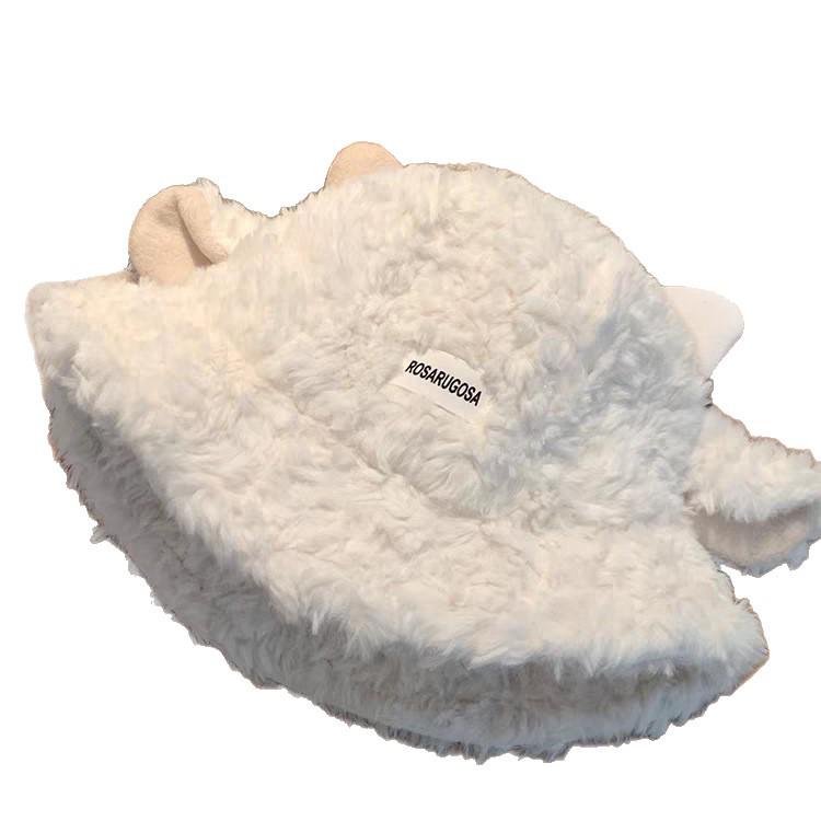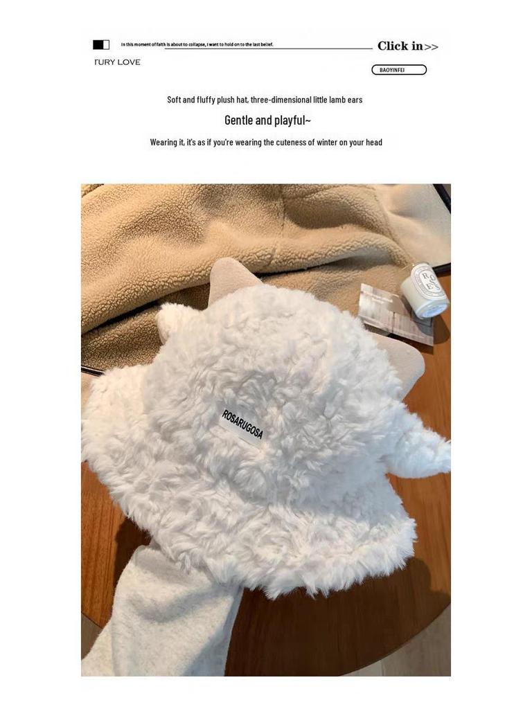 Милая плюшевая женская панама с ушками ягненка - Новинка осени/зимы 2025, теплая шляпа-ведро, визуально стройнящая лицо