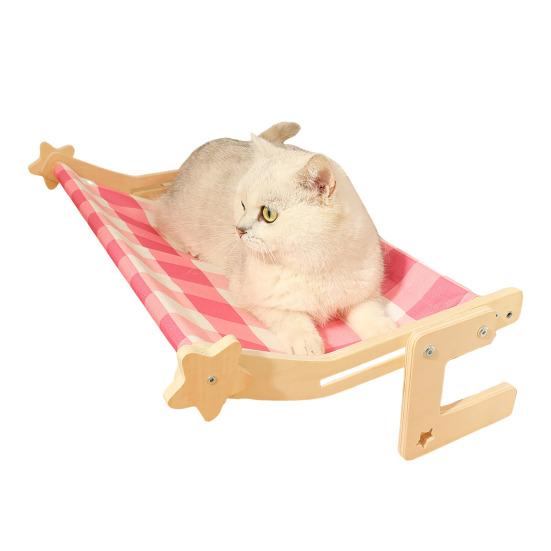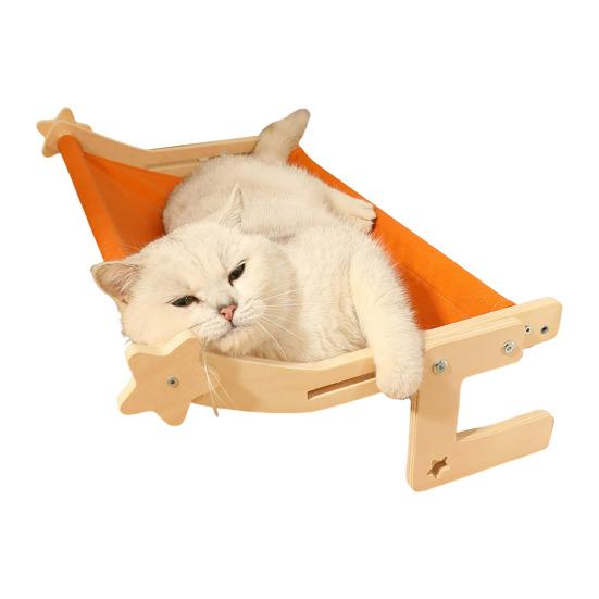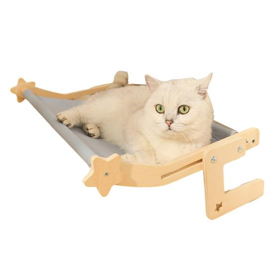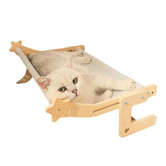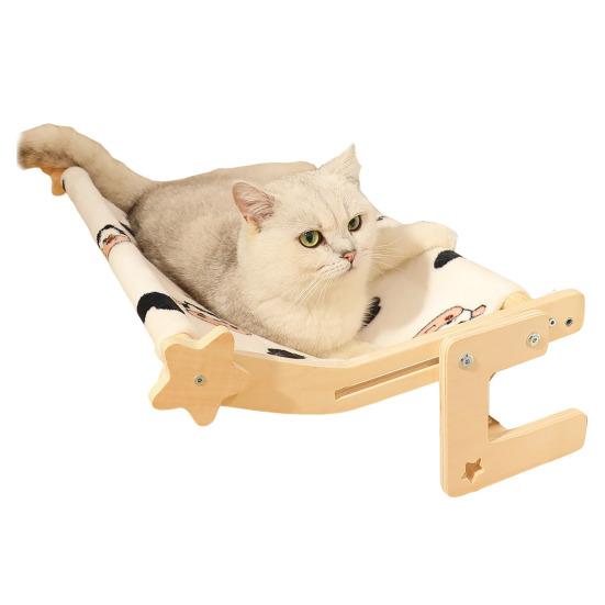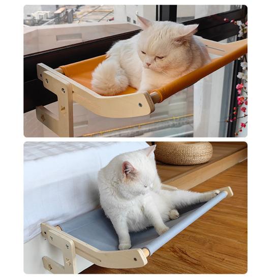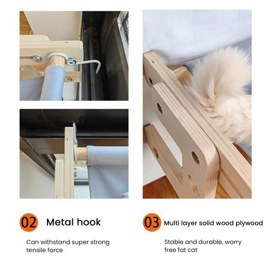 Установка без инструментов, Универсальное размещение: Попрощайтесь с присосками и сверлением! Легко перемещайте эту лежанку для кошек на окно между окнами, шкафами или прикроватными рейлингами без разборки.. Зафиксируйте его с помощью выдвижных деревянных опор для беспроблемного перемещения и времени для общения с вашей кошкой.