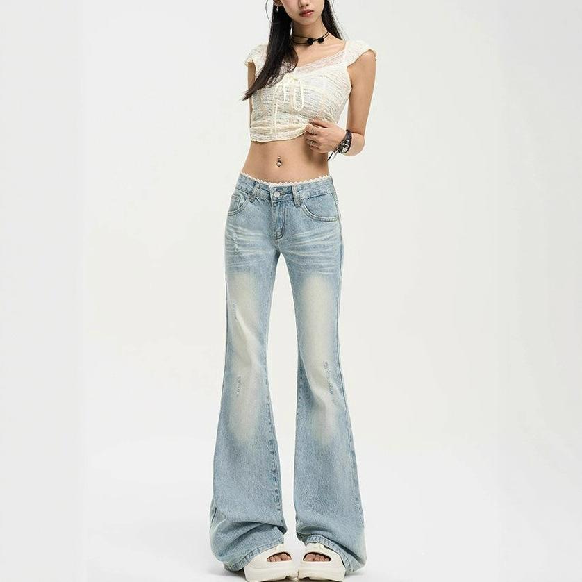 Кружевные вставки Микро-большие джинсы Женские Летние Выбеленные Голубые Ретро Скинни С низкой посадкой Джинсовые брюки Ретро Уличный стиль Мешковатые Длинные Джинсы для Леди
