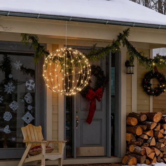 Прочная металлическая каркасная конструкция: Эта сфера, изготовленная из прочной металлической проволоки, отличается стабильной формой, устойчивой к деформации.. В сочетании с мягким световым шнуром, он обеспечивает долговечность и легкий вес для длительного подвешивания.