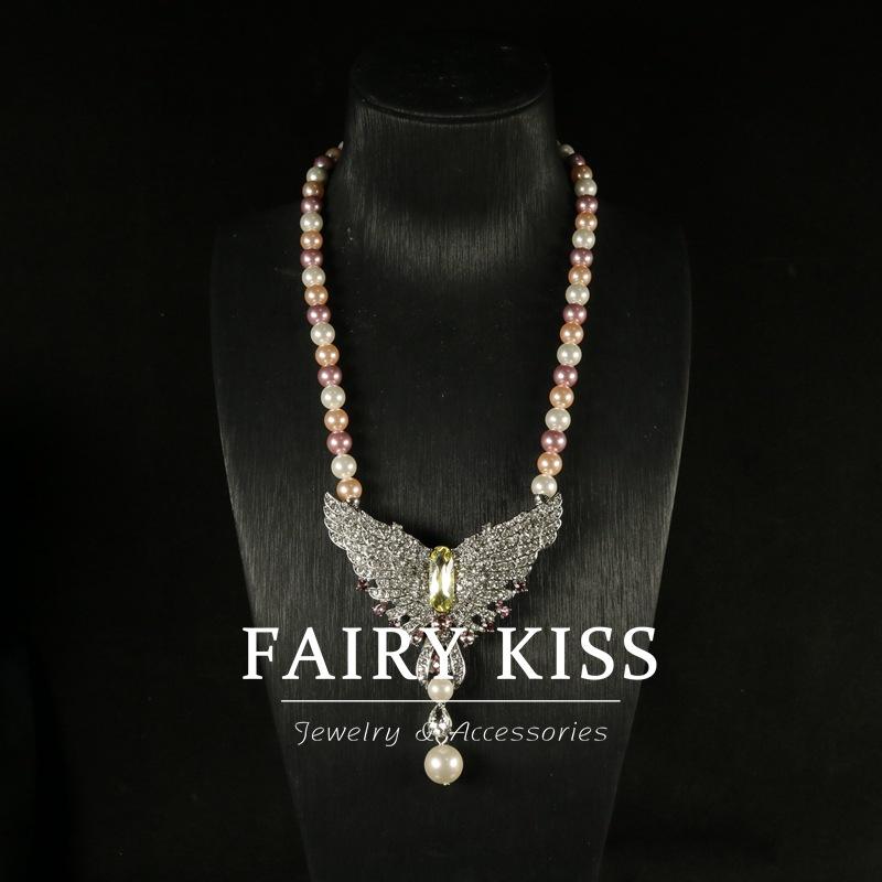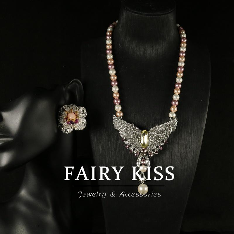 Комплект серег Цветной искусственный жемчуг Цепочка Густо усыпанный бриллиантами Крылья Ожерелье Брошь Двойного назначения Изысканные серьги-цветы