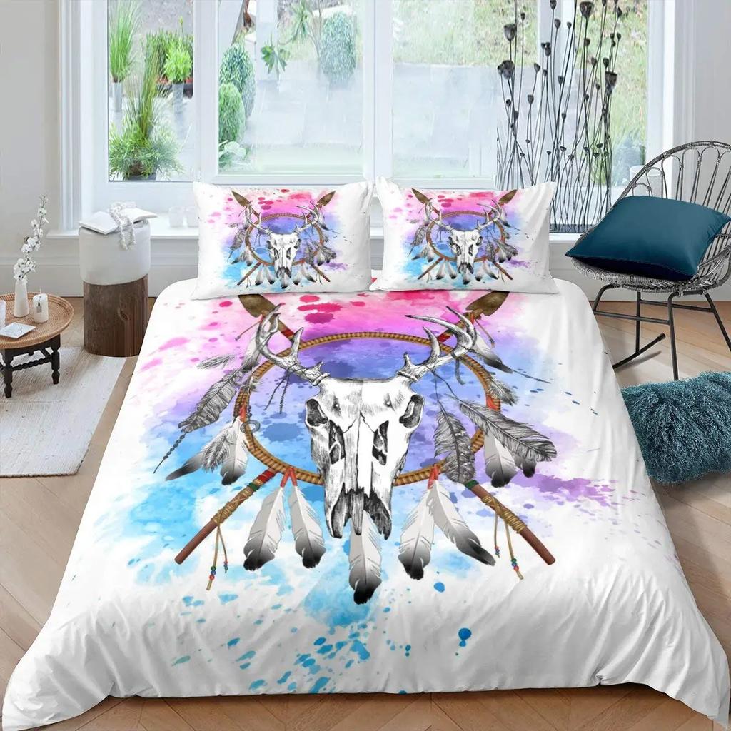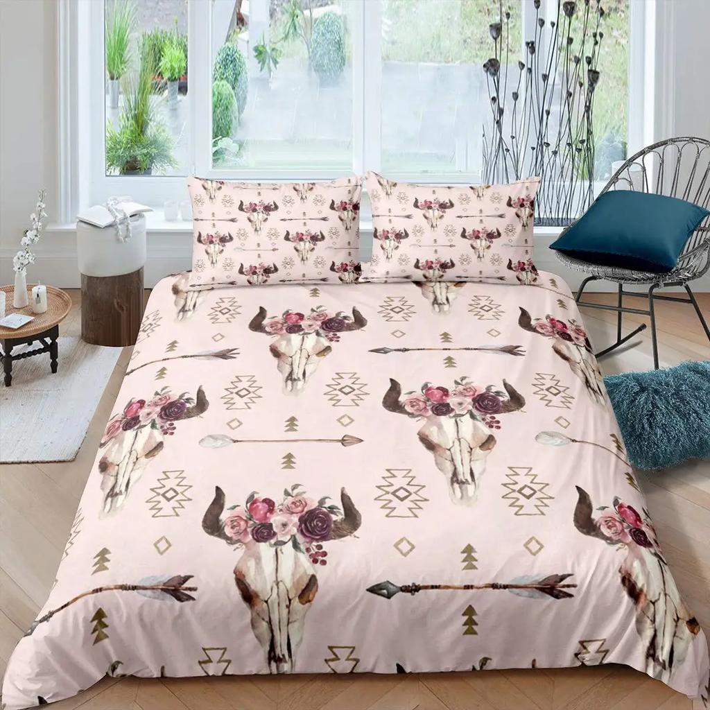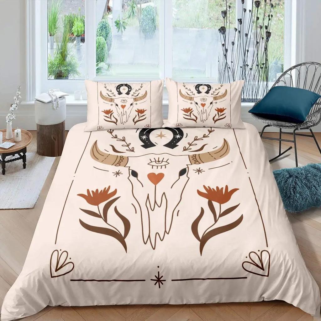 Bull Skull Duvet Cover Chic Feather Bedding Bohemian Exotic Branches Flower for Kids Teens Women Men Room Decoration Quilt Cover