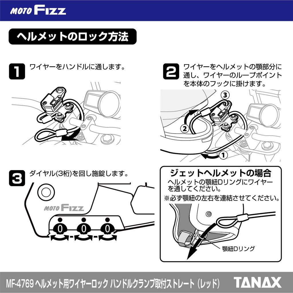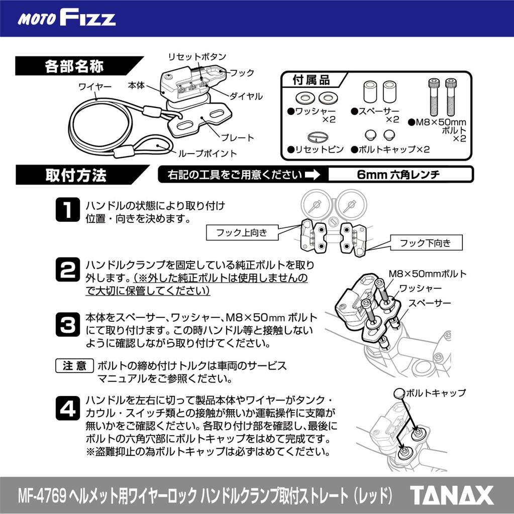 TANAX MF-4769 Motorcycle Anti-Theft Helmet Wire Lock Handle Clamp Mounting, Straight Red, 3-Digit Dial Lock, 232.2 ft (600 m)