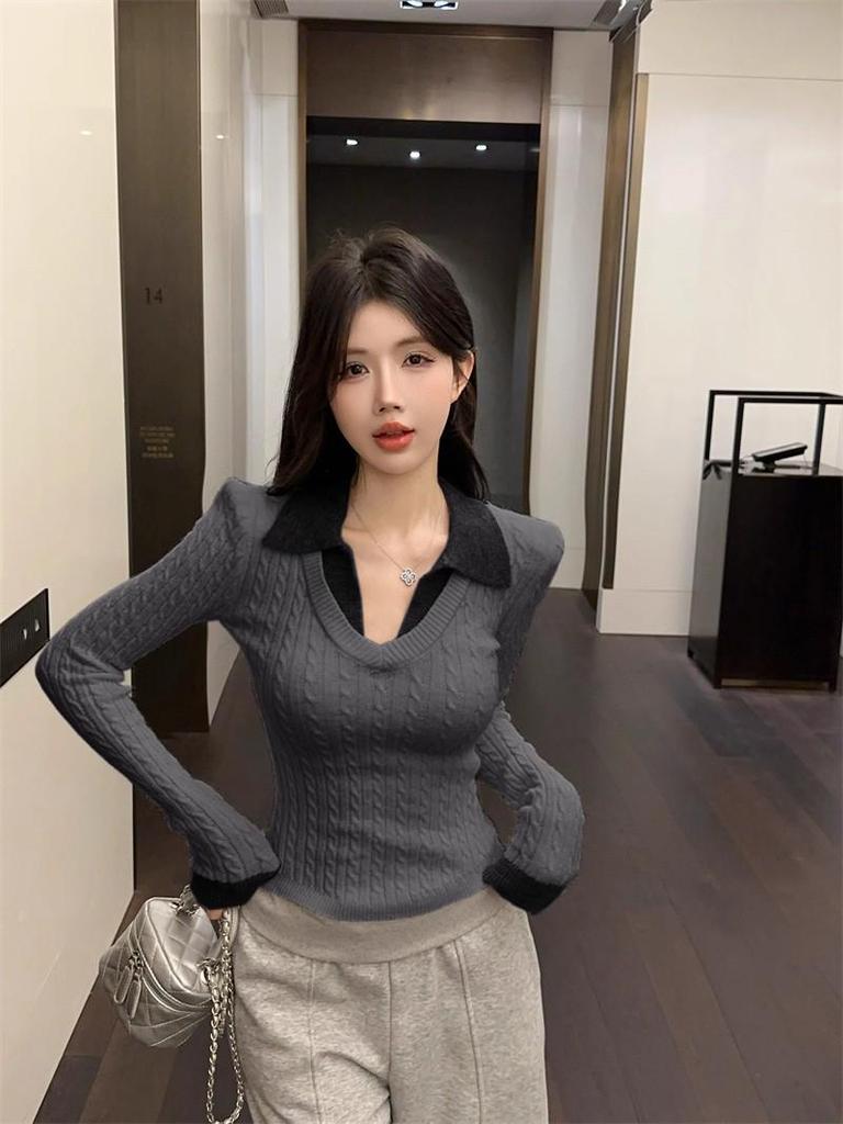 Женский трикотажный свитер в стиле Гонконга с V-образным вырезом и воротником поло - Модный тренд Осень/Зима