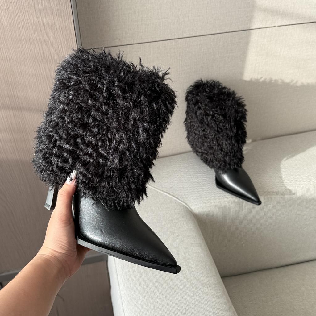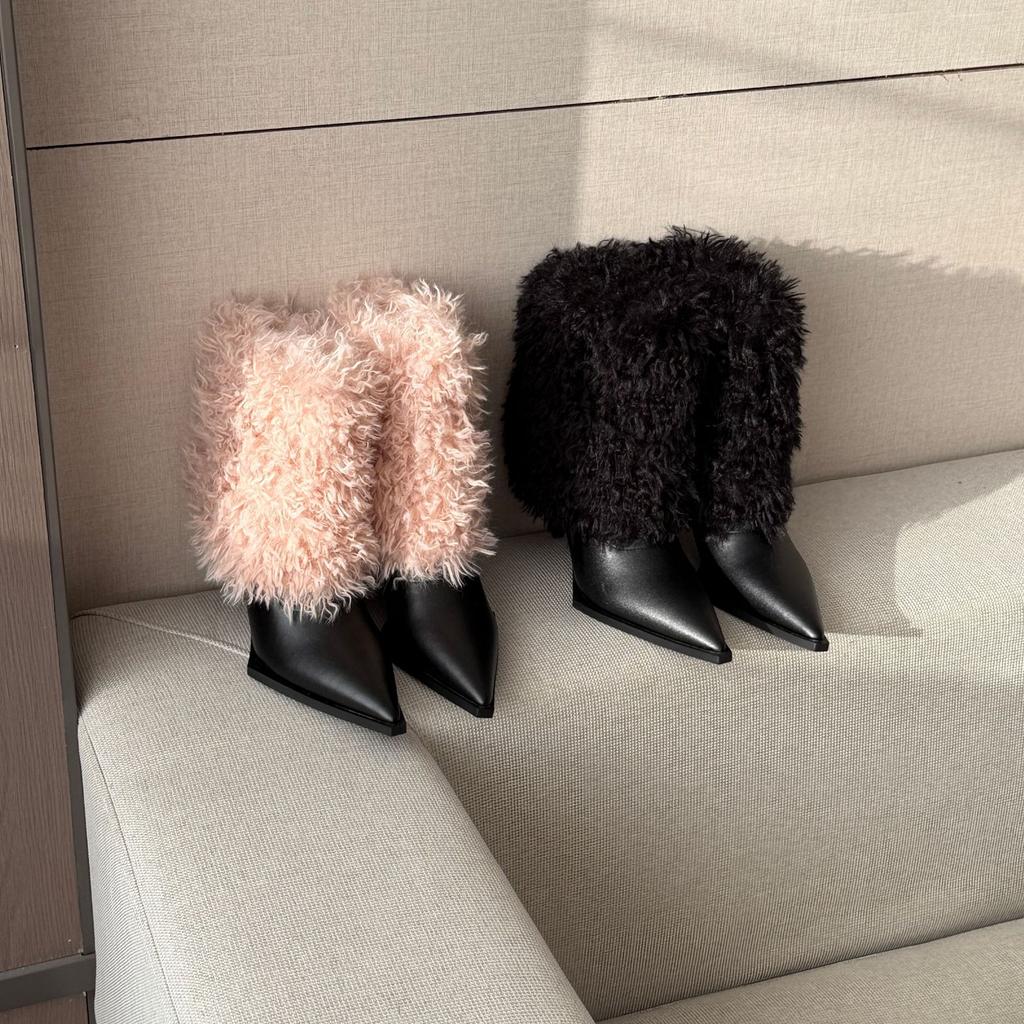 2025 осень новые толстые на высоком каблуке розовые пушистые модные ботинки Мартин с острым носком до середины голени закрывают ноги сексуальные женские короткие ботинки