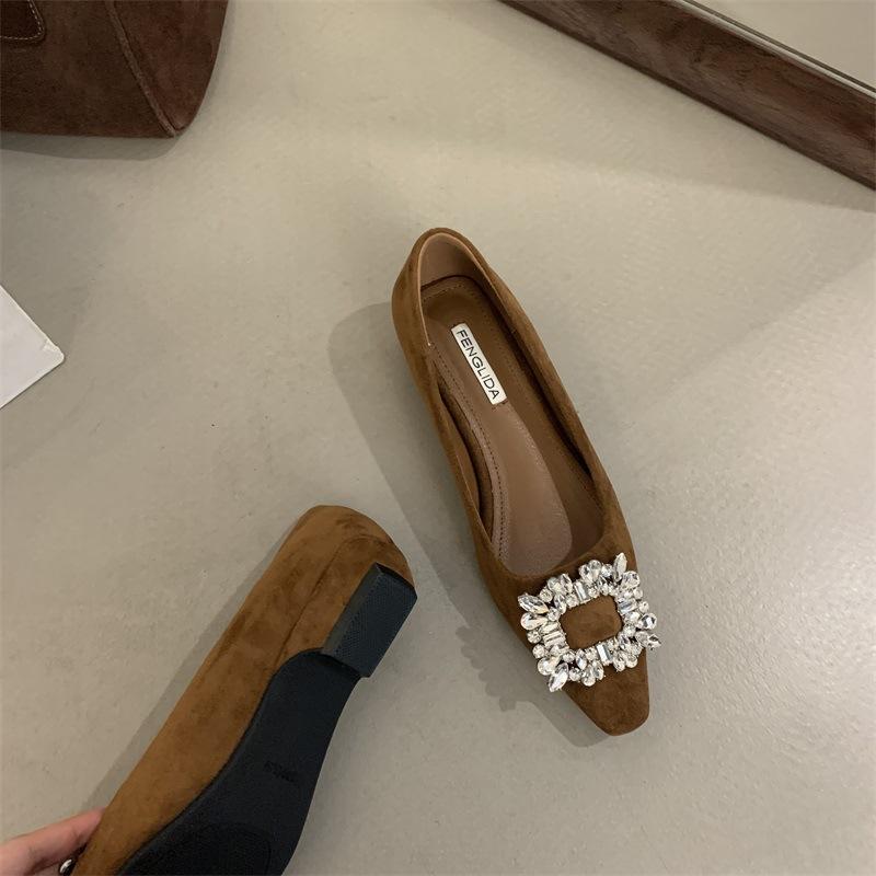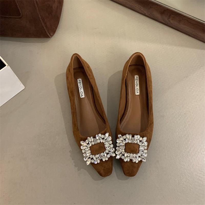 Ретро замшевые туфли на плоской подошве с квадратной пряжкой из стразов для женской коллекции весна-осень 2025, новые французские туфли с квадратным носком и неглубоким вырезом на мягкой подошве Doud
