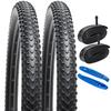 Includes two 27.5x2.25 bicycle tires, two bicycle tubes, two rolls of bicycle rim tape, and two tire levers.