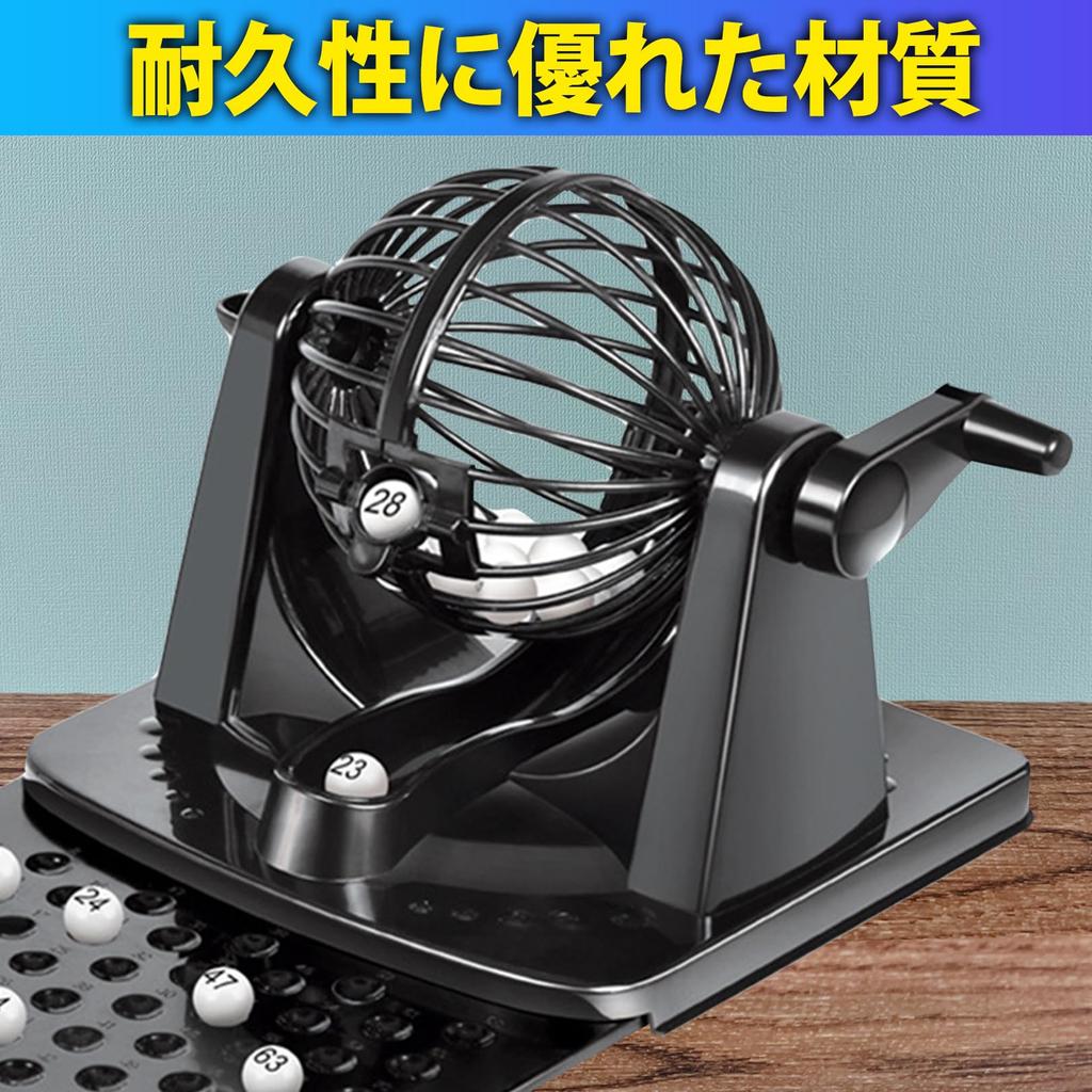 This complete bingo game set includes a bingo machine, 20 cards, balls (1-75), and a ball tray. The machine uses the classic handle-operated garapon system. It's lightweight and compact, making it easy to carry, and the ball tray conveniently displays all previously drawn numbers.