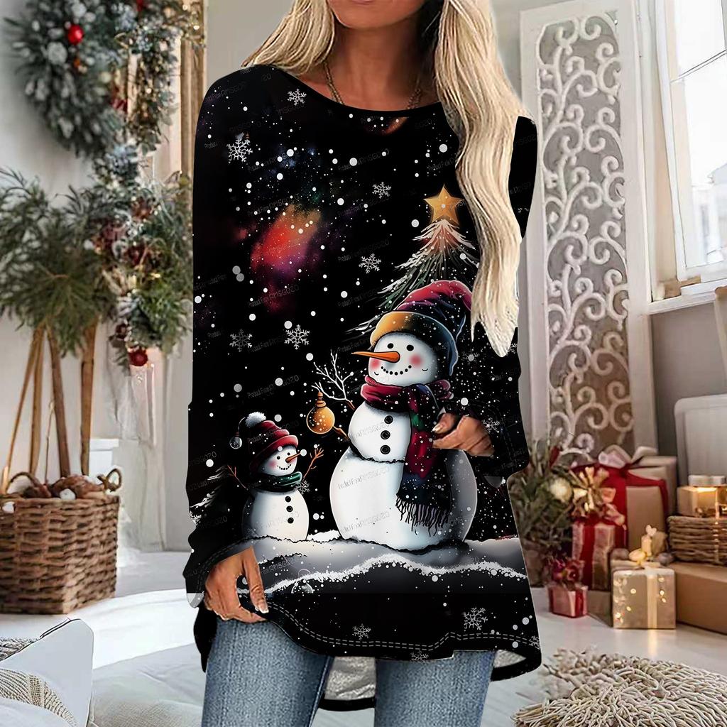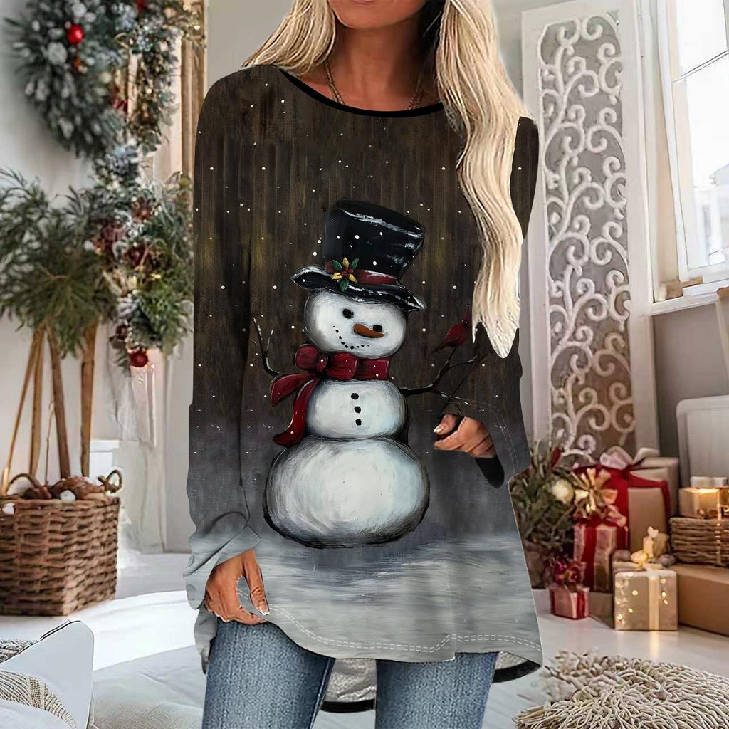 Женская футболка больших размеров с принтом снеговика на весну и Рождество, удобная, с длинным рукавом, круглым вырезом, повседневная, свободного кроя, средней длины, топы