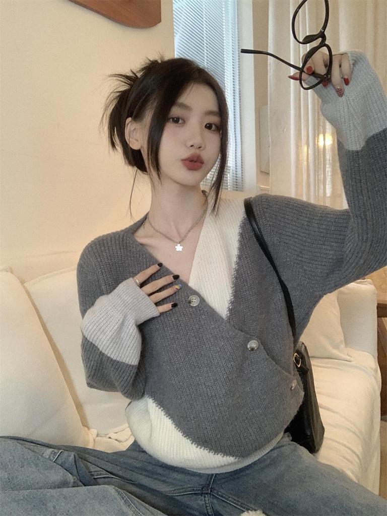 Винтажный женский свитер с V-образным вырезом и цветными блоками - Осень/Зима, корейский стиль, повседневный приталенный крой с диагональной застежкой на пуговицы