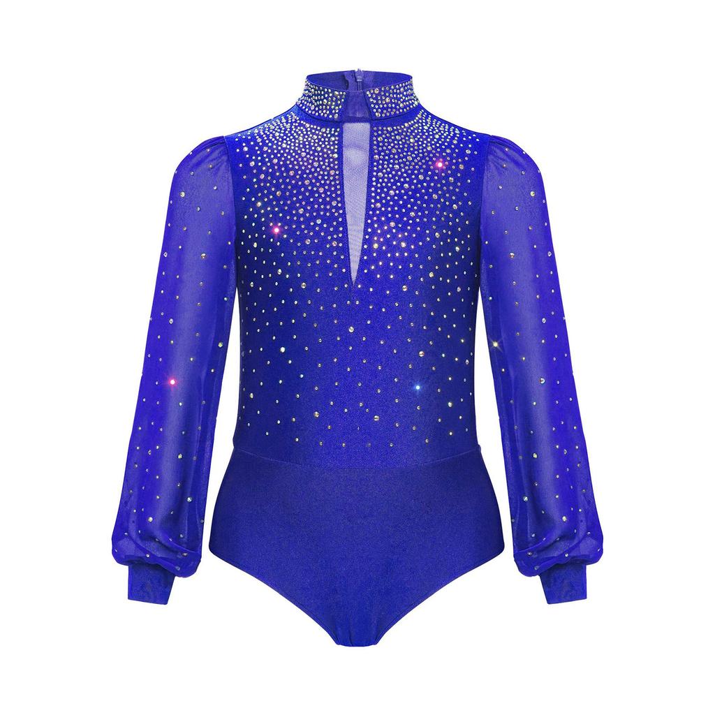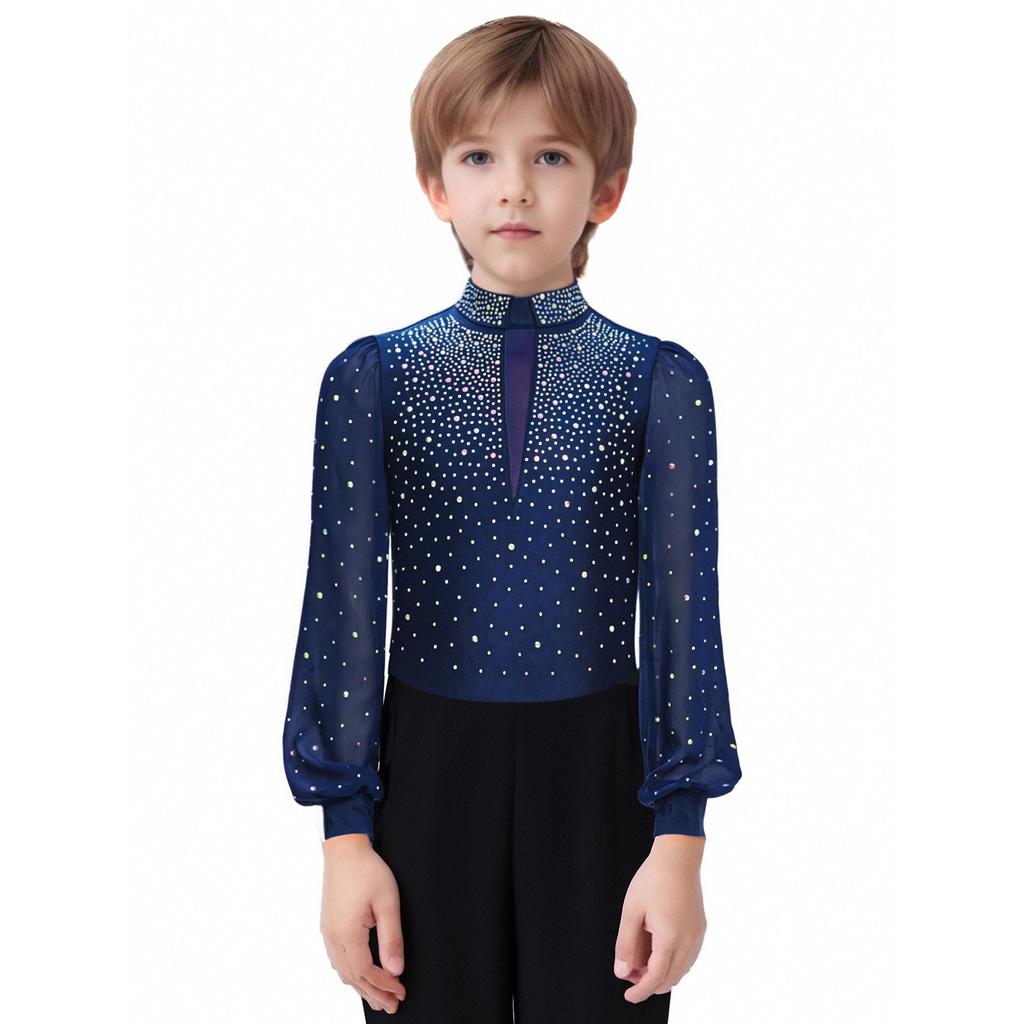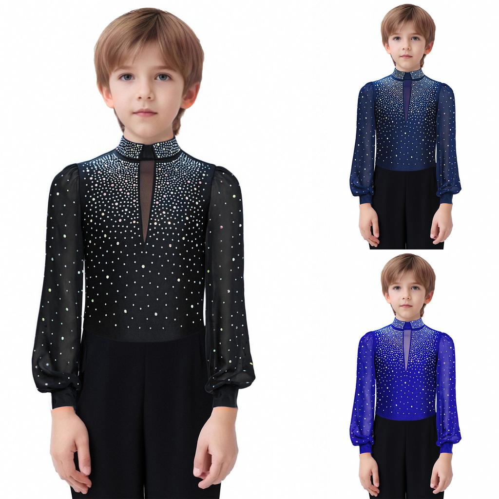 Комбинезон для фигурного катания для мальчиков, с длинным рукавом, с воротником-стойкой, украшенный стразами, с застежкой-кнопкой в области ластовицы, с молнией сзади