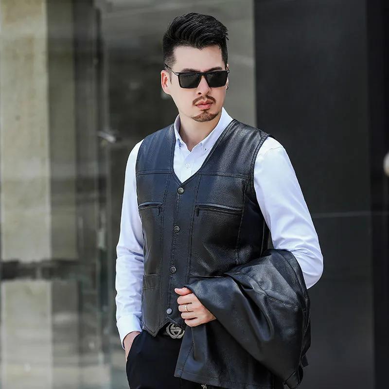 Новый мужской свободный кожаный жилет Корейский приталенный жилет без рукавов Повседневный