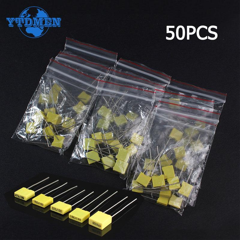 50 шт. полипропиленовый конденсатор, 100 В, полипропиленовая защитная пластиковая пленка, комплект корректирующих конденсаторов 1 нФ ~ 0,47 мкФ 102J 103J 473J 224J474J