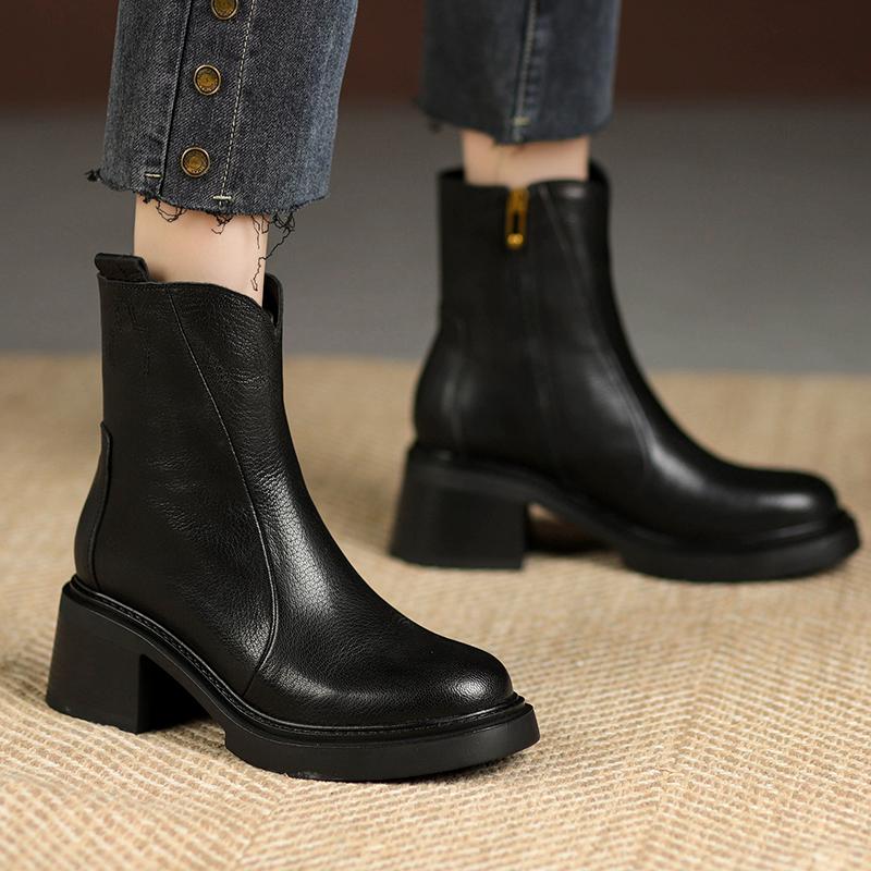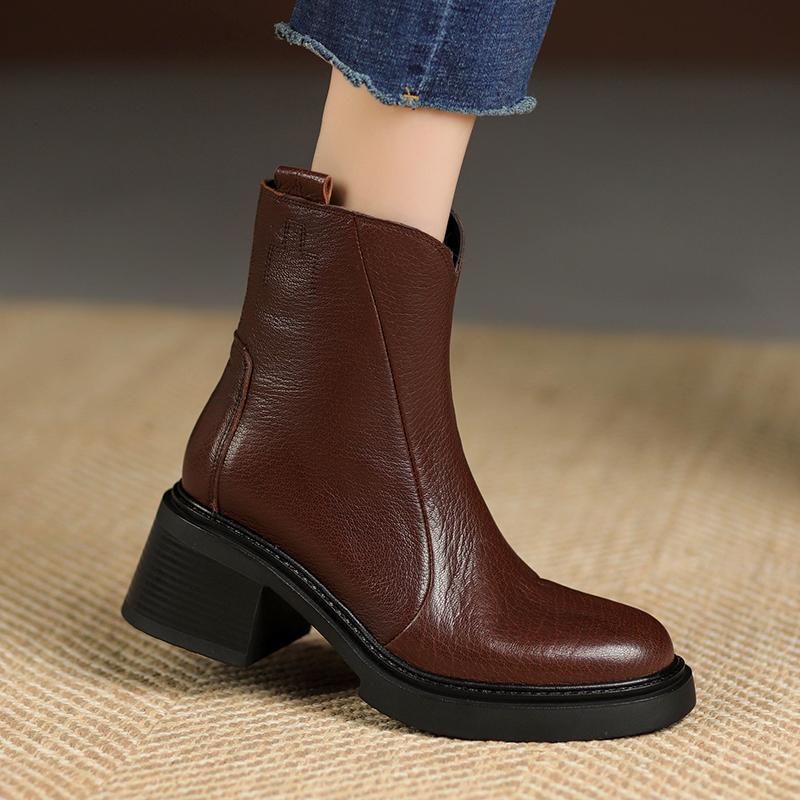 Зимние женские ботинки Кожаные ботинки Массивная подошва Осенние Ретро Натуральная кожа Женская обувь Ботильоны на высоком каблуке Ботинки челси