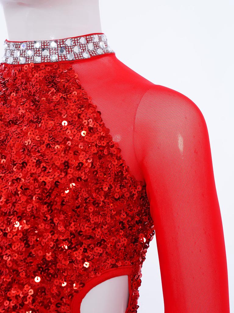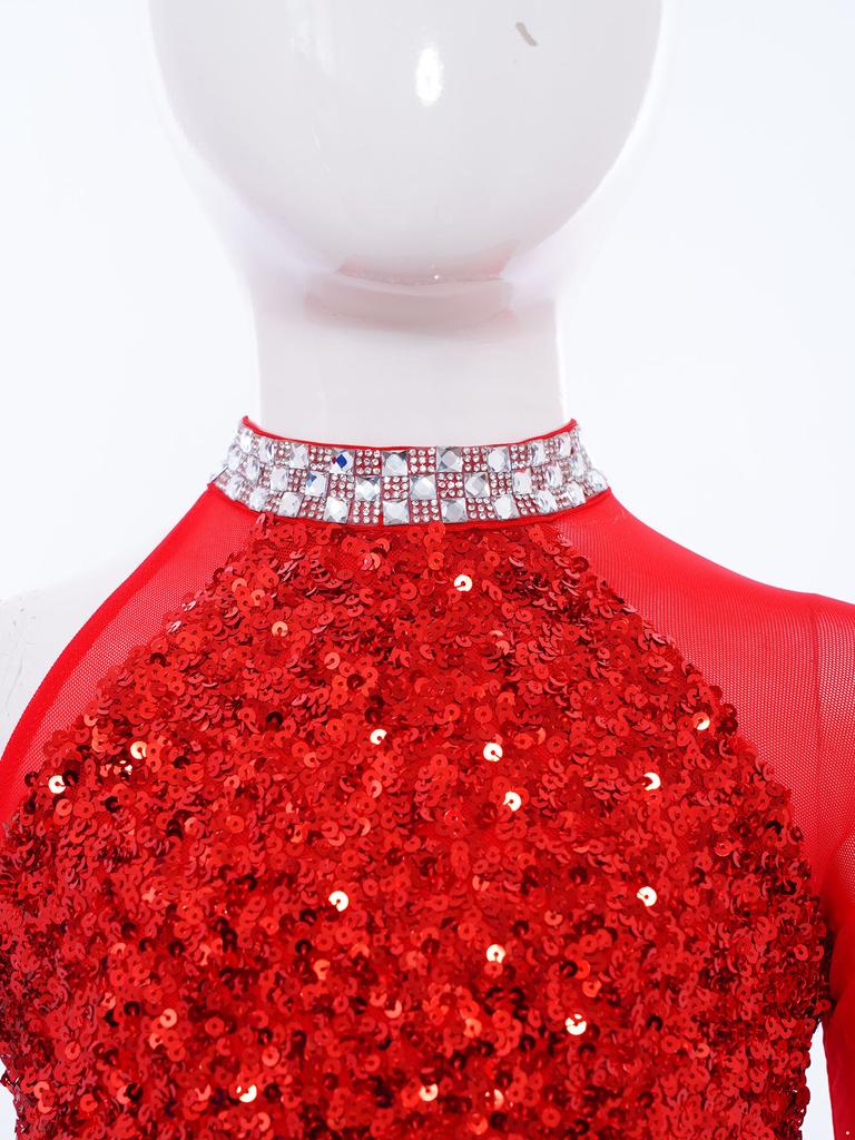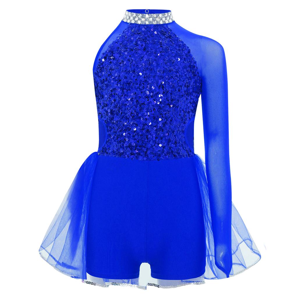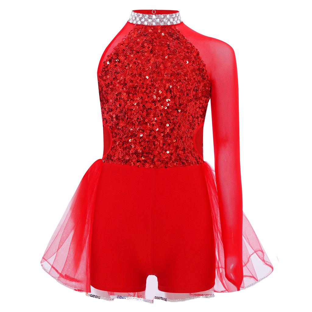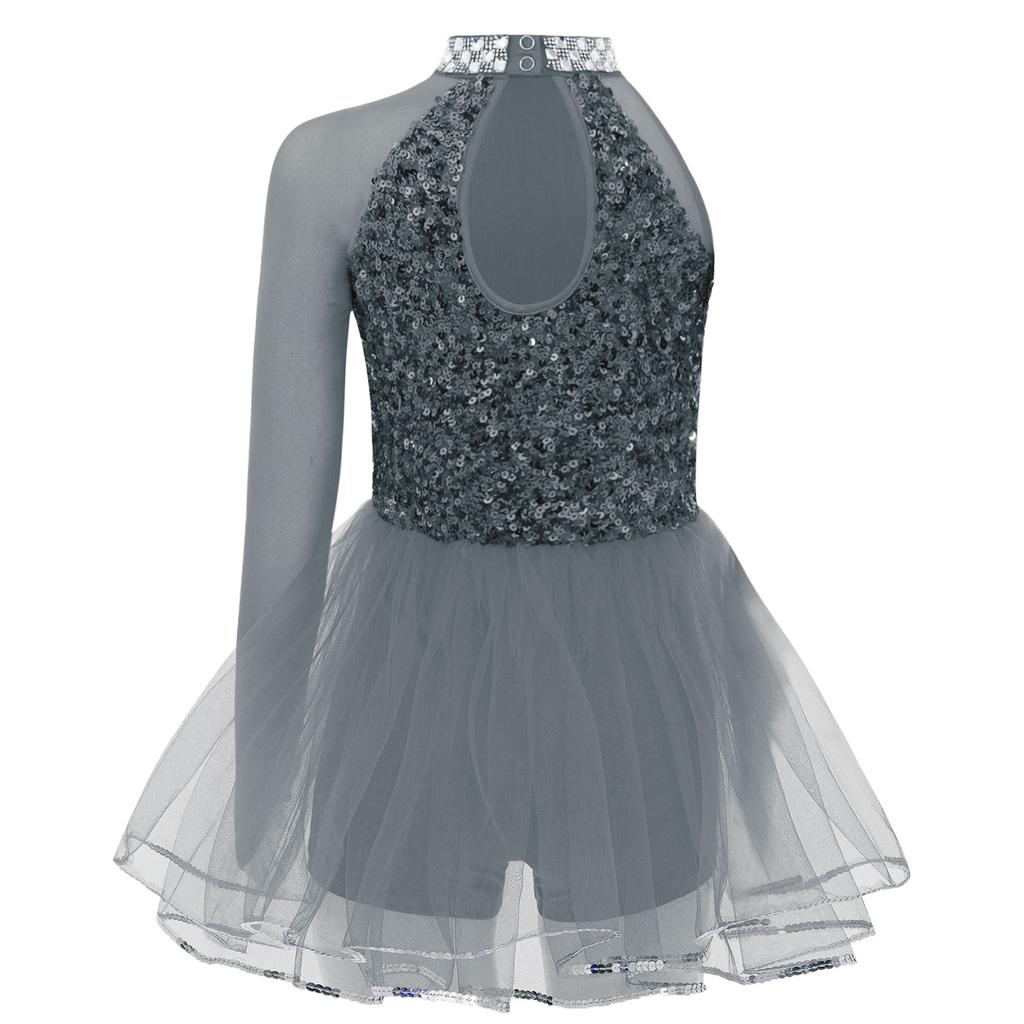 Девочки Танцевальный Костюм-Комбинезон Блестящий Лиф с Пайетками Юбка из Тюля Гимнастический Купальник Вырез-Капля на Спине Вырез на Талии Асимметричный Дизайн