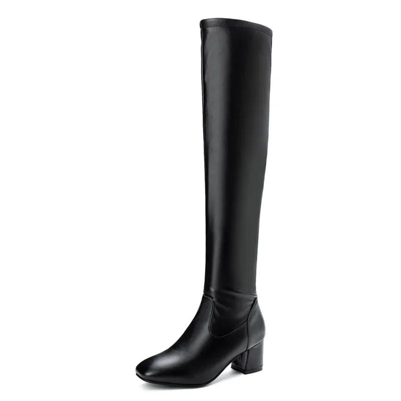 Классические высокие сапоги женские, осень-зима, квадратный каблук, средний, выше колена, черные, белые, туфли, женские, больших размеров