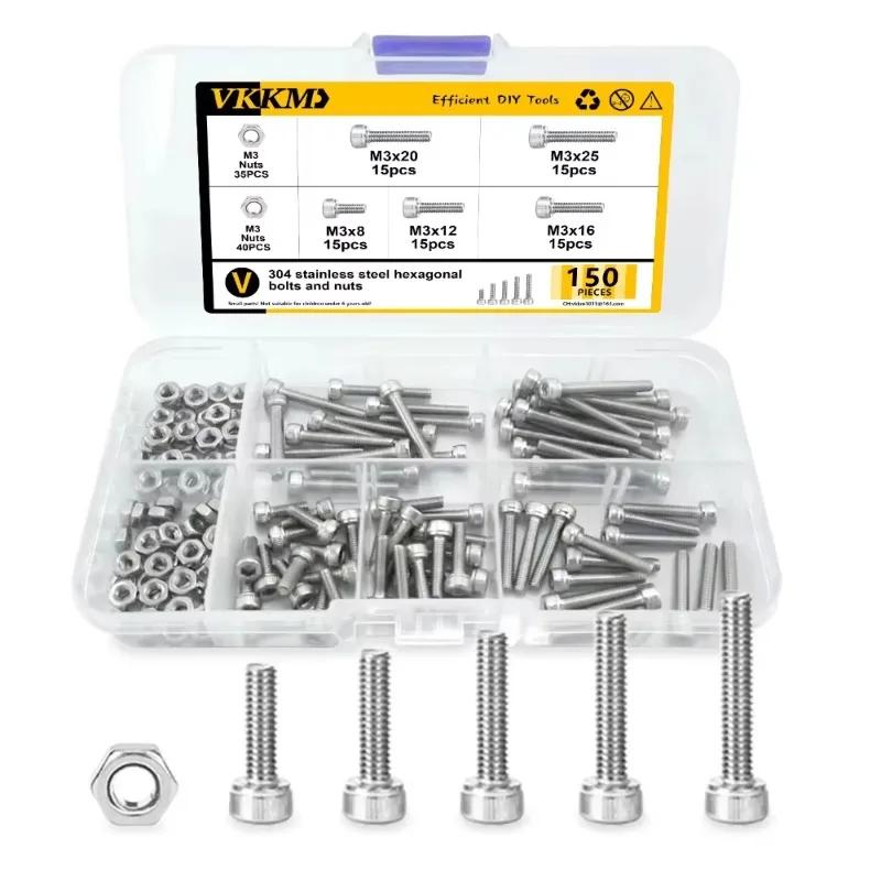 VKKM Набор из 150 штук винтов с шестигранным углублением под ключ M3 из нержавеющей стали 304, различных размеров, для сборки оборудования, незаменимый для крепления.