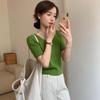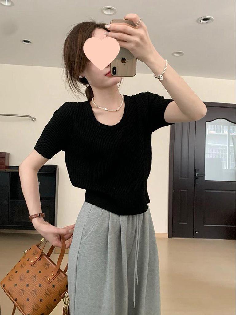 2025 Весна Повседневный трикотажный топ с U-образным вырезом и короткими рукавами в корейском стиле - Однотонный — купить товар онлайн с бесплатной доставкой по всему миру!
