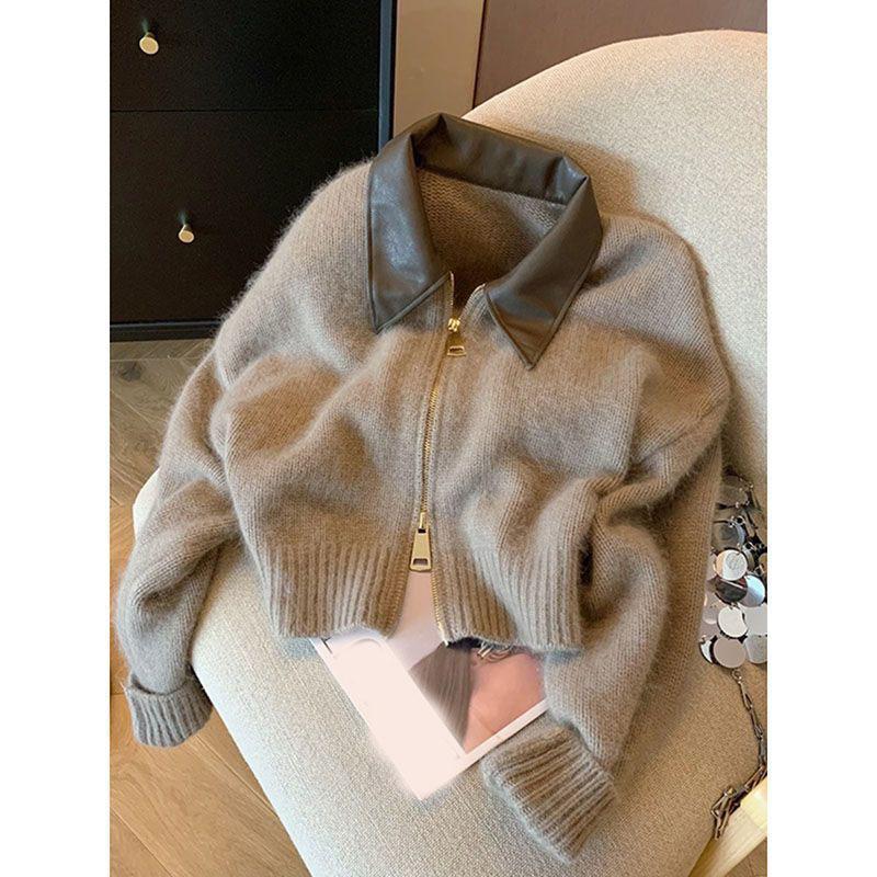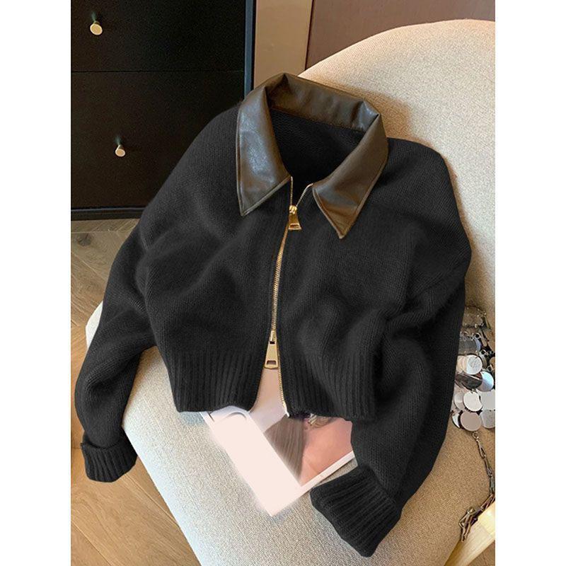 Осенне-зимний вязаный свитер с кожаным воротником и двойной молнией, женский мягкий винтажный уличный топ с длинными рукавами