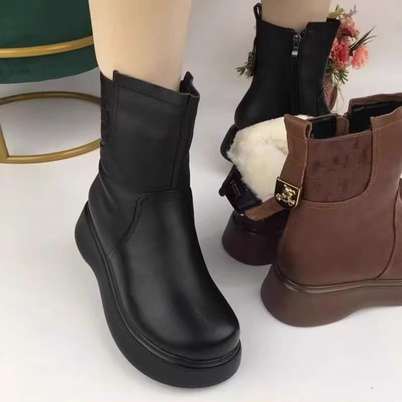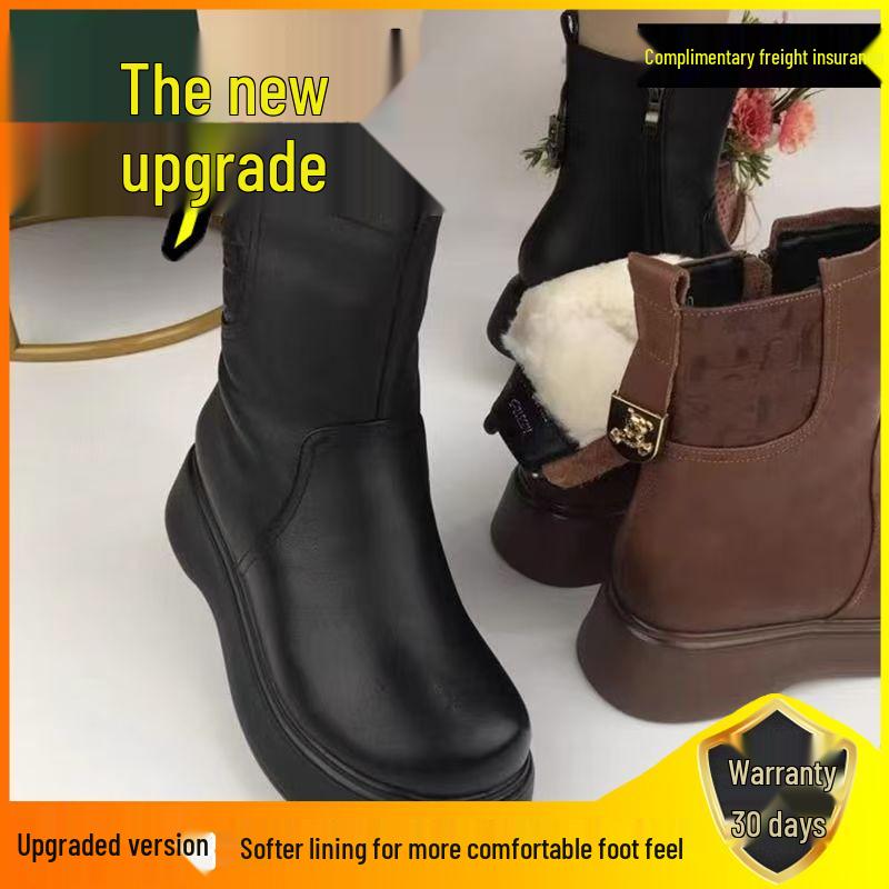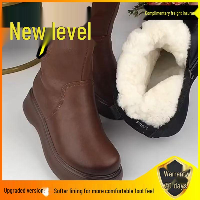 Женские теплые зимние сапоги до середины икры - Кожа и мех, на толстой подошве с плюшем, готовы к зиме для мам