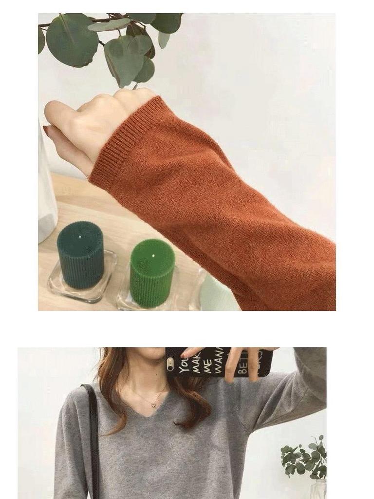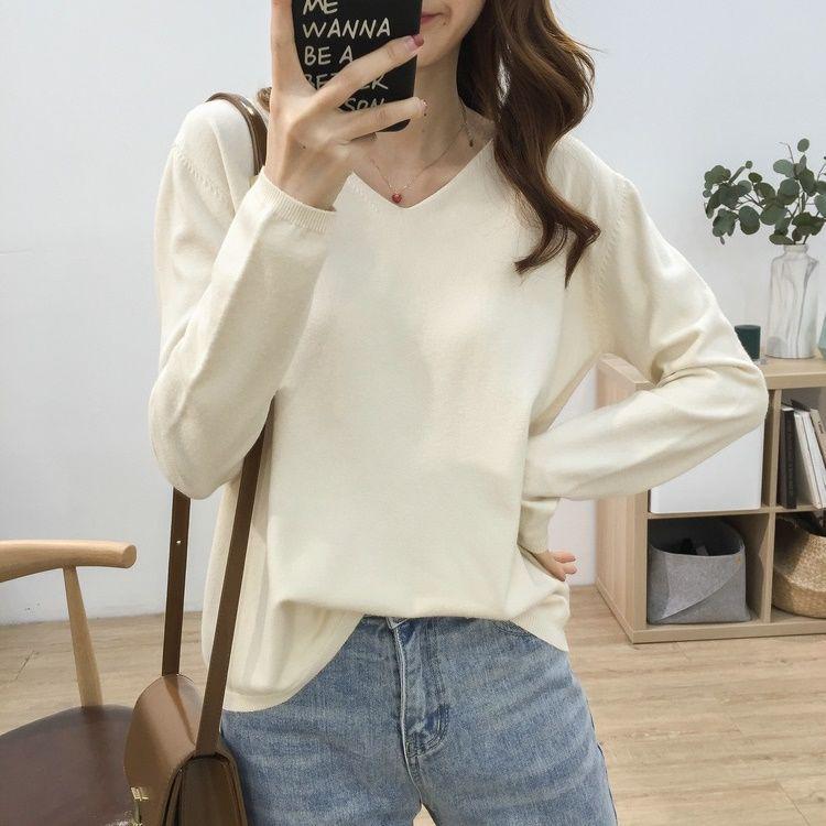 Женский вязаный свитер с V-образным вырезом: Большой размер, Свободный крой, Стройнящий, Однотонный, Идеально подходит для ранней осени и зимы